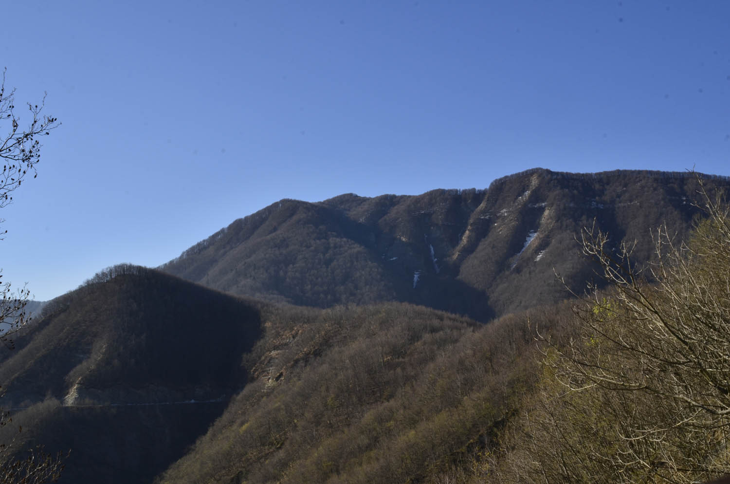 (003a - 003b – 003c) – Dalla S.P. 4R del Bidente, Colla Tre Faggi e pressi, si hanno le viste più prossime del contrafforte, benché da quota inferiore o mediamente simile; nella 003a si nota pure l’incisione del Fosso del Fiumicino presso le sue origini (26/03/2012 – 11/02/2016).