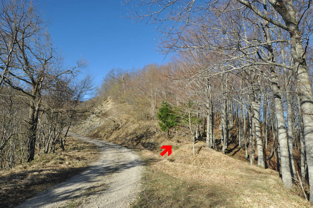 (010a) – Superato Poggio della Serra si nota un sentiero che si inoltra verso monte diretto a Poggio Scali (probabilmente corrispondente a un antico percorso per tale vetta) ma, prima di giungere a Pian del Pero, il confine insuperabile della Riserva Integrale di Sasso Fratino ferma ogni ulteriore aspettativa (31/03/2012).