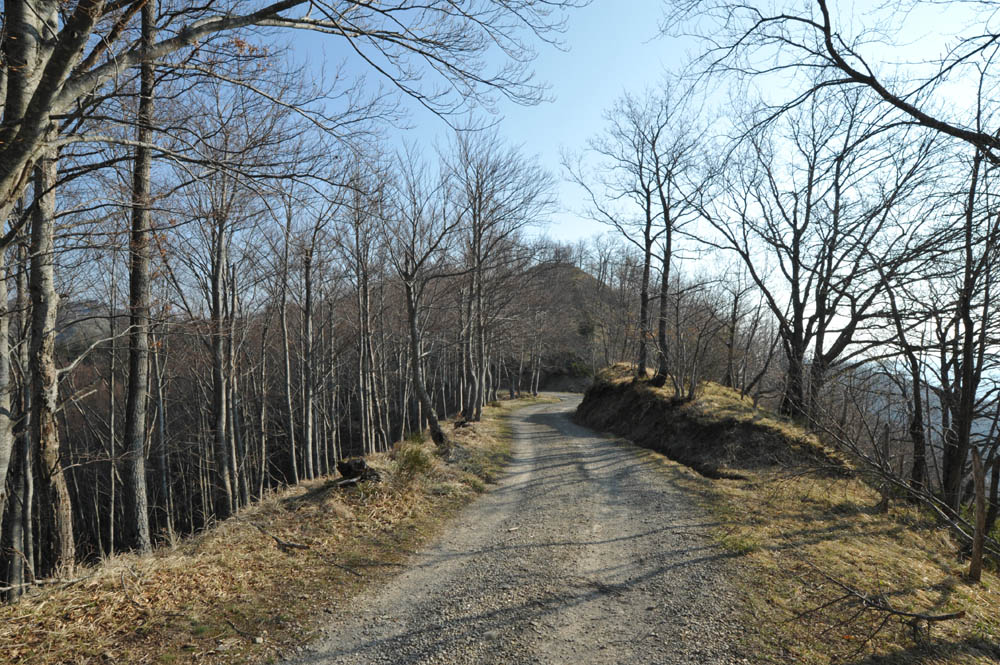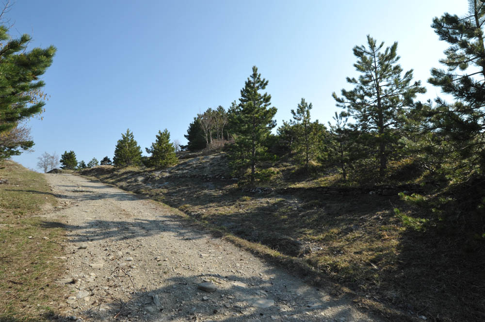 (012h – 012i) – Vista da valle e da monte della vetta del Monte Grosso, tagliato dalla rotabile sul versante occidentale. Nella 2^ vista si nota, sulla sx, l’innesto della S. Vic.le del Ciriegiolone che, se non già fatto in altra occasione (cfr. precedenti 005a - 005b – 005c), può essere percorsa brevemente ora a scopo osservativo (26/03/2012).