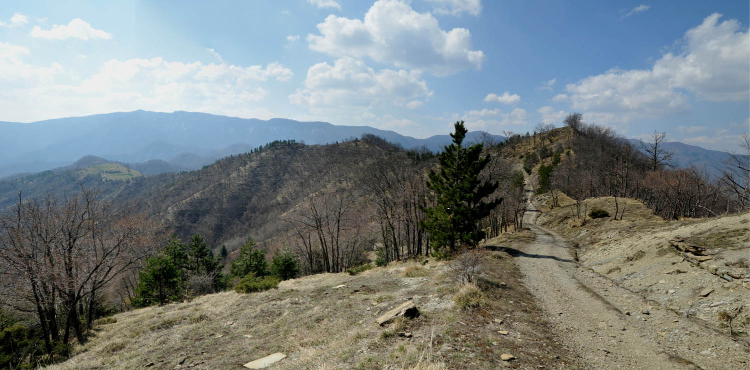 (015c – 015d) – Proseguendo verso Ronco dei Preti si può avere una visione da Est del tratto di contrafforte appena superato e di Poggio Squilla (26/03/2012).
