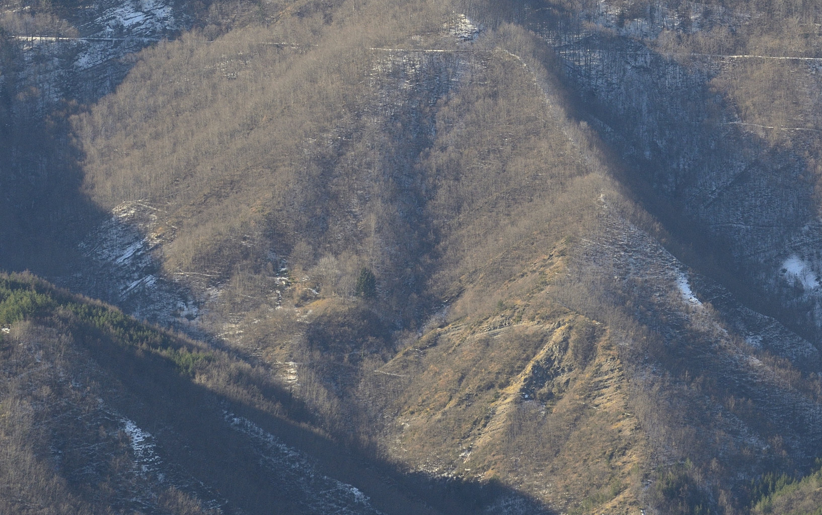 00a1 - 00a2 - 00a3 - Dal Monte Piano si può avere una delle più ampie viste dell’intero Spartiacque Appenninico e del contrafforte secondario che si stacca da Poggio allo Spillo/Passo della Crocina, con il suo tratto iniziale della Bertesca aggirato dalla S.F. del Cancellino al Baraccone, nel punto apparentemente sormontato dal Monte Penna; Poggio della Bertesca costituisce con evidenza il vertice della valle del Fosso del Castagnaccio dove, tra la macchia del versante soleggiato, si notano due o tre abeti isolati presso i quali si trova Castagnaccio (1/01/12).