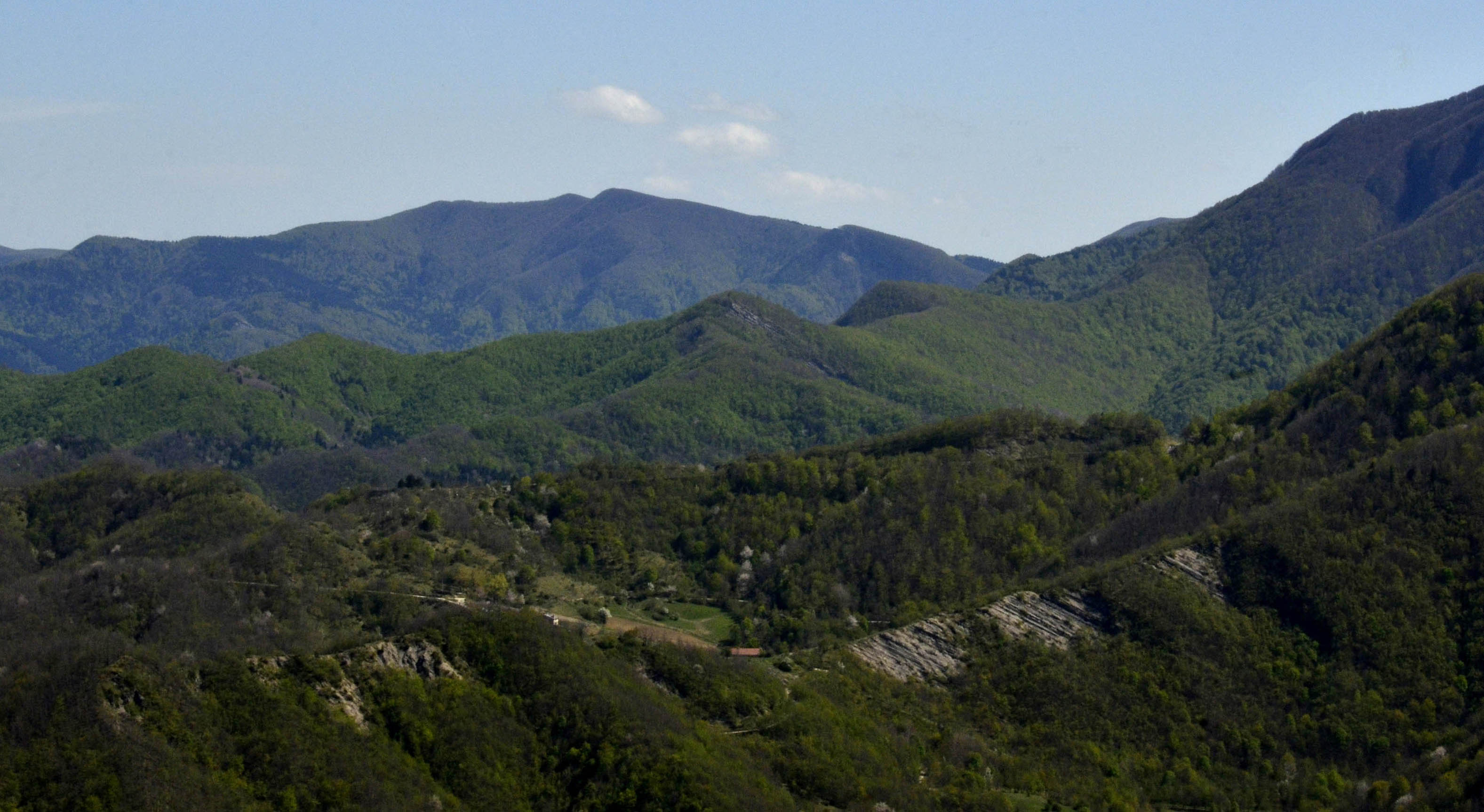 00b1/00b4 – Proseguendo sul Sentiero degli Alpini fino ai pressi di P.gio Bini si abbraccia il versante vallivo delle Celle e si riesce a contestualizzare il bacino idrografico del Fosso delle Mandriacce, di cui tra l'altro si scorge la parte più elevata delimitata da Costa Poggio dei Ronchi e Omo Morto con le due pieghe corrispondenti ai suoi rami di origine e l'area degli insediamenti (16/04/16).