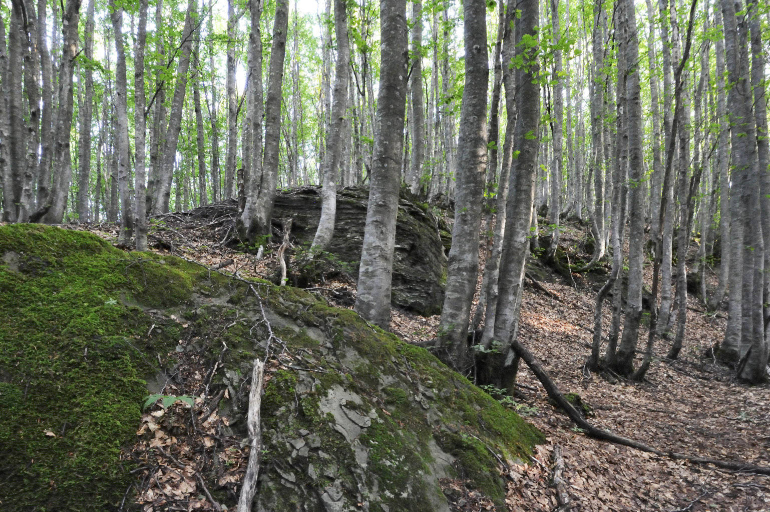 004b/004l – Il ridotto versante meridionale di Poggio Martino tra i Fangacci mostra una ridotta pendenza ed una grande quantità di massi erratici e la stessa sommità appare piuttosto dolce, ma subito interrotta sul lato nord-orientale da un canalone forse un tempo percorso da una pista (27/06/18).