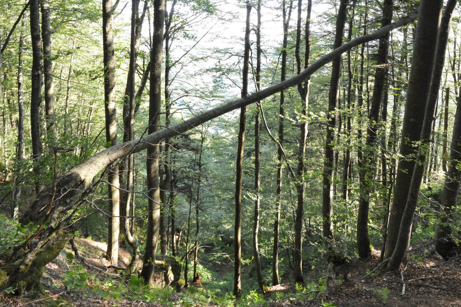 Il tratto di Spartiacque pertinente all’ambito descritto corre su altitudini tra le più elevate dell’Appennino forlivese, minime poco inferiori ai m. 1300 e massime fino ai m. 1500-1650, con abbassamenti in corrispondenza dei valichi e rialzamenti in coincidenza con i nodi montani da cui si distaccano le diramazioni montuose. L’inclinazione degli strati, immersi a SO, spiega la ripidità dei versanti esposti a settentrione della Bastionata di Campigna-Mandrioli, dove le pendenze, mediamente pari al 35%, raggiungono acclività del 70-100%, dando alla montagna il noto aspetto di imponenza e invalicabilità, con pareti evidenzianti la stratigrafia “a reggipoggio” modellata dall’erosione e la formazione di canaloni fortemente accidentati, con distacco detritico e lacerazioni della copertura forestale. A tale asprezza morfologica si contrappone la generale morbidità del crinale dovuta alla lentezza dell’alterazione delle bancate arenacee, la cui superficie coincide, appunto, con quella della stratificazione.