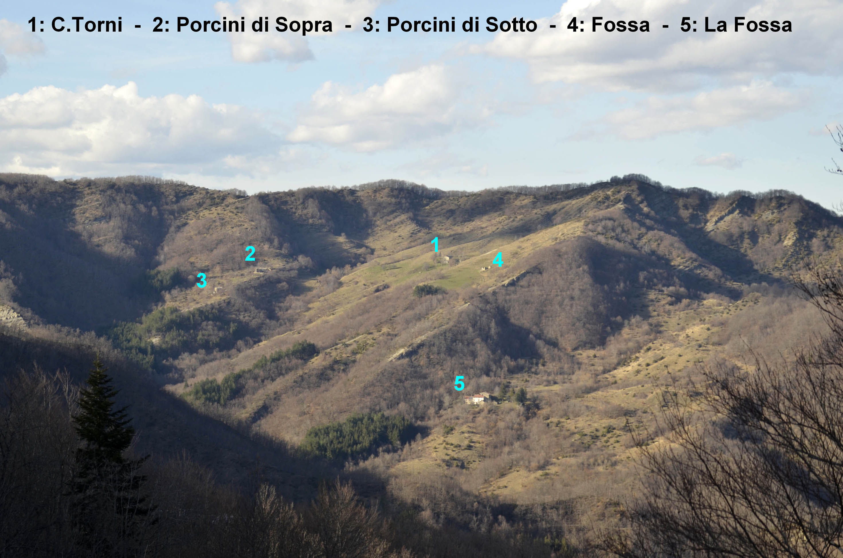 00b1/00b6 – Dalla S.F. di Giogo di Castagno (vi si giunge tramite la S.P. n.94 del Castagno dal Passo della Calla) tagliata sotto Poggio Piancancelli, scorci panoramici consentono la vista della Valle delle Celle dove, tra l’alternanza di prati pascoli, aree brecciate, brulle e incolte e l’inteso foliage autunnale, si notano Torni e Fossa in diverse stagioni e si riconosce la cresta dove correva l’antica strada che transitata da La Fossa nel risalire dal fondovalle si dirigeva verso il crinale passando presso Fossa e Torni, qui ormai trasformata in pista poderale (16/04/16 – 7/10/17 - 1/01/19)