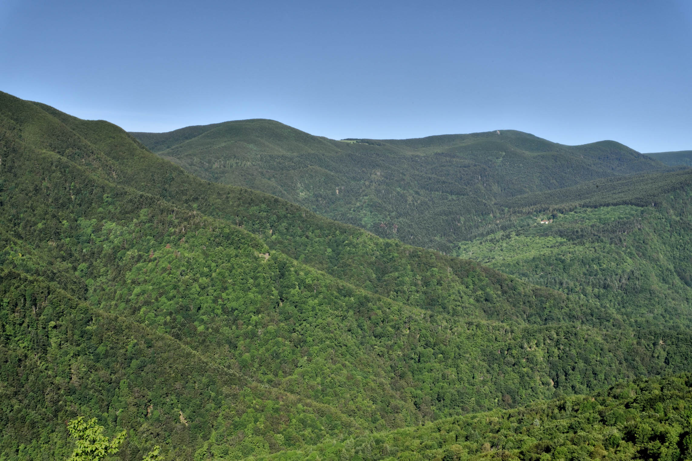 001f/001n - La S.P. 4 del Bidente offre molteplici panoramiche e scorci del versante dx della valle del Bidente e delle dorsali che la compenetrano, così ben distinguendo le Coste delle Cullacce e di P.gio del Ballatoio nel distaccarsi dalla biforcazione della vetta principale del Poggione, sullo spartiacque appenninico, e di P.gio Termini dalla vetta minore, alla quale è collegato da una selletta formata con la prominenza di un poggetto. Tra Il Poggione e P.gio Pian Tombesi si nota il profilo quasi orizzontale del Raggio Lungo col suo rilievo intermedio (26/03/12 – 11/02/16 – 20/05/18).