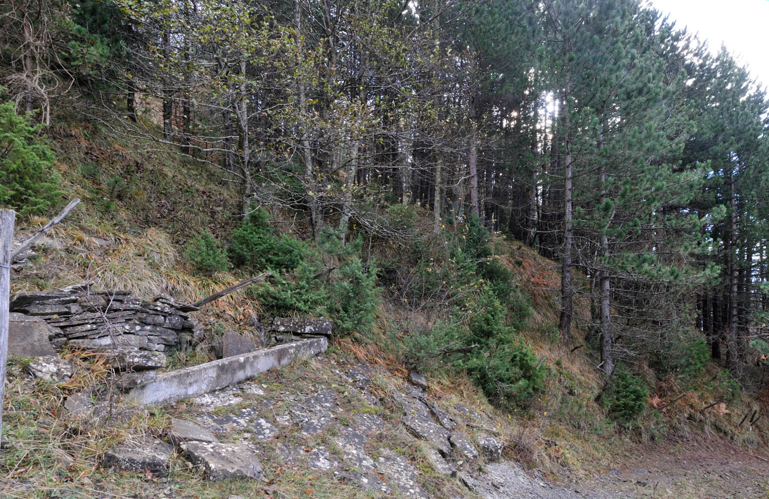 00f1/00f6 – Accanto alla pista/tratturo che scende negli alpeggi, prima del sito di Casa Sabelli si trova un abbeveratoio inaridito e i resti di una piccola costruzione (26/11/16 - 29/12/18).
