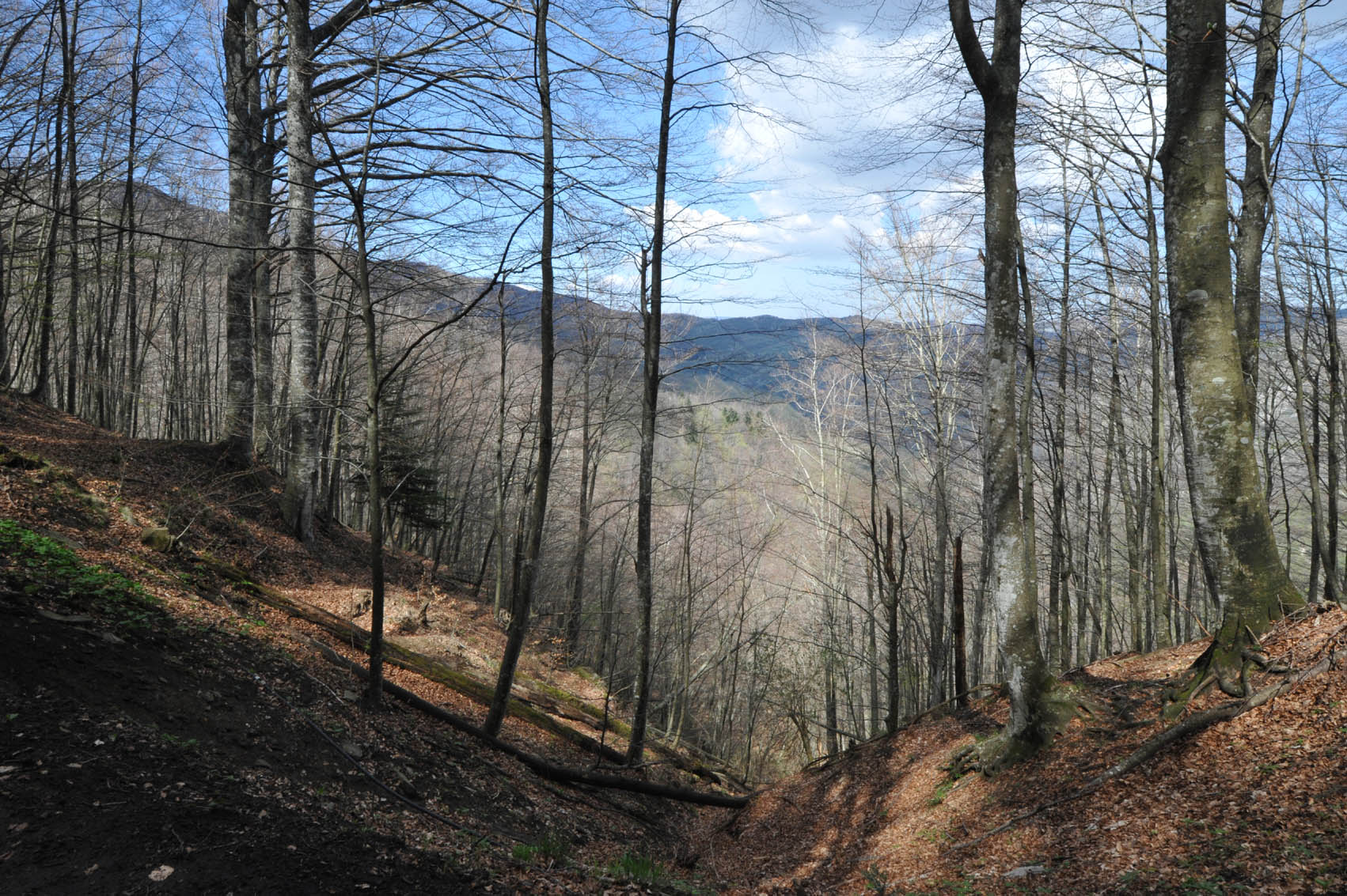 00c4 – 00c5 – 00c6 - Dal crinale che delimita la valle del Fosso di Ristèfani e si sviluppa verso Poggio Aguzzo si nota la linea netta del crinale tra i Poggi Palaio e Zaccagnino, tra le macchie scure delle abetine nel contrastare e la faggeta in veste invernale, da cui si staccano le coste che delimitano le valli dei Fossi delle Secchete, dell’Inferno e/o di Coloreta e di Poggio Rabio, con indice fotografico (25/04/18)