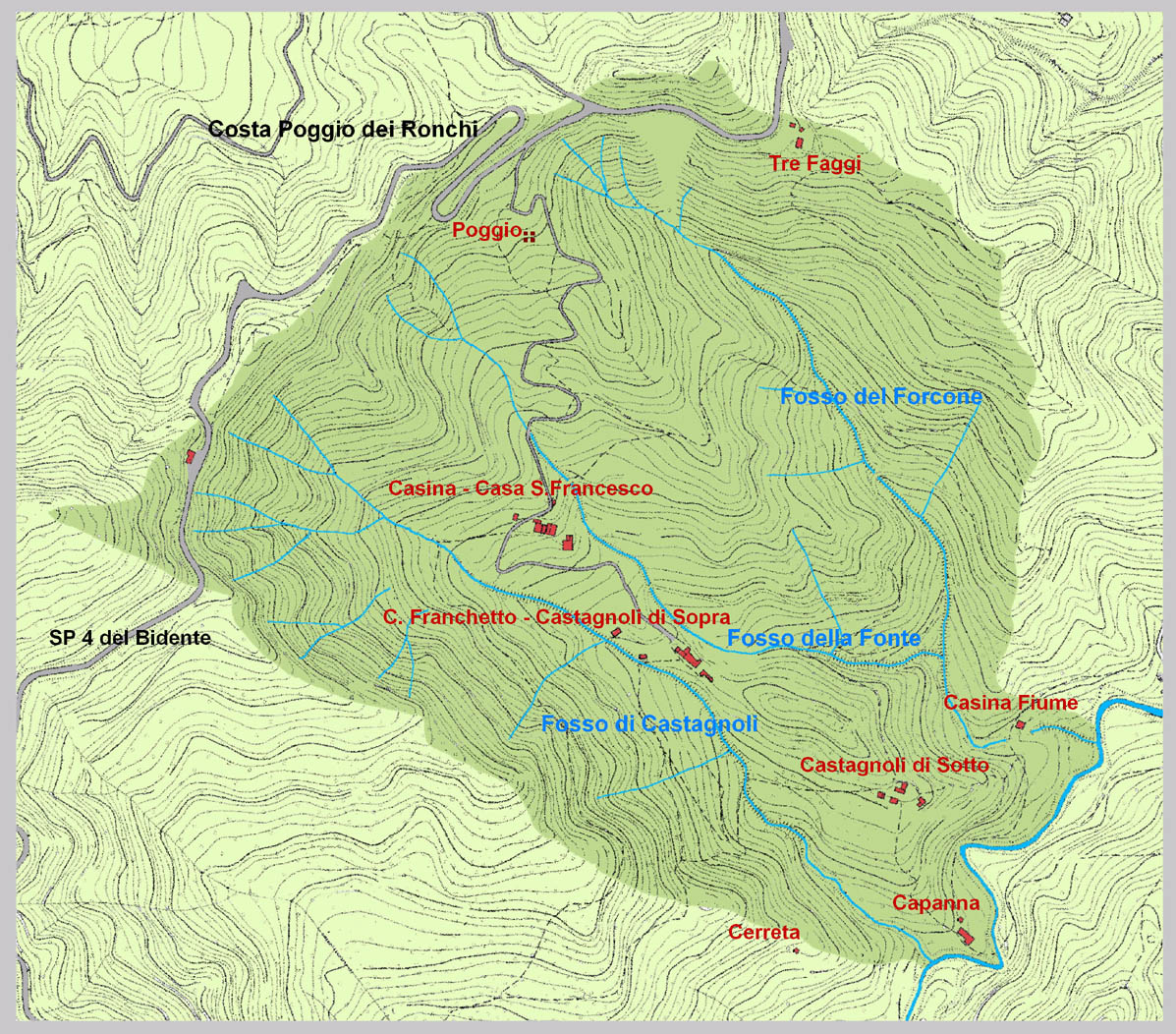 00d1 – Schema da cartografia moderna dei bacini idrografici delle Valli dei Fossi di Montaccesi, di Castagnoli, della Fonte e del Forcone.