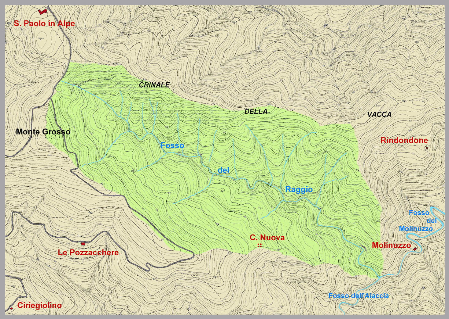 Fosso del Raggio o Rio Fossati - Coordinate WGS84: Origine (M. Grosso) 43° 52’ 26” N / 11° 47’ 59” E - Sbocco (F.so Molinuzzo) 43° 51’ 56” N / 11° 49’ 3” E - Quote: Origine 1000 m – Sbocco 608 m - Sviluppo 2 Km