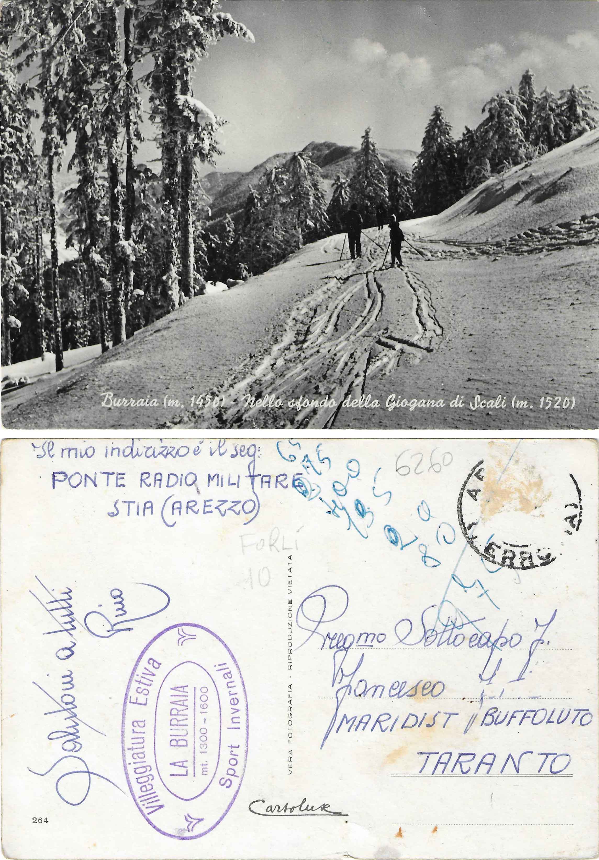 034 – Cartolina della Cartolux, n. serie 264, Burraia (m. 1450) – Nello sfondo della Giogana di Scali (m. 1520), di interesse anche in quanto oltre a recare sul retro il timbro “Villeggiatura Estiva Sport Invernali LA BURRAIA” ha come mittente un militare di servizio al Ponte Radio Militare, probabilmente ancora in funzione alla Burraia essendo forse costruenda la stazione di Poggio Sodo dei Conti. La cartolina, spedita ma con timbro abraso, risalirebbe alla fine degli Anni Cinquanta per via del n. di serie (collezione personale).