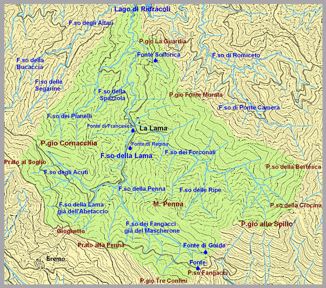 00c1 – Schema da cartografia moderna del bacino idrografico del Fosso della Lama e suoi affluenti degli Acuti, dei Fangacci, dei Pianelli, della Spazzola e dei Forconali.