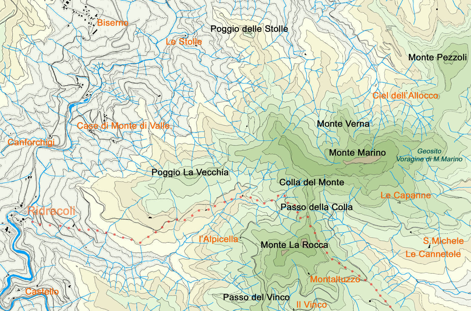 Con pendenza non eccessiva il contrafforte si sviluppa ora fino alla lunga e ristretta sella intagliata dalla pista forestale che ha inizio con la Ripa di Ripastretta, attraversa la Colla del Vinco e termina con il Passo del Vinco, dove si biforca per scendere con lunghi percorsi moderni verso Ridràcoli e verso Poggio alla Lastra con deviazione per Strabatenza. La viabilità antica guadagnava invece le sommità dei Monti La Rocca e Marino, venendo attraversata dalla nota Mulattiera di Ridràcoli sul Passo della Colla, però sul versante orientale proseguiva preferibilmente a mezza costa. Dalla Colla del Monte, cerniera tra i Monti La Rocca e Marino, due dorsali si sviluppano verso la valle di Ridràcoli evidenziando rispettivamente il Poggio la Vecchia e il Poggio delle Stolle, mentre su una diramazione minore proveniente direttamente dal Marino spicca il Monte Verna. Lo sviluppo del contrafforte secondario prosegue oltre il Monte Marino disegnando un ampio arco diretto verso Isola, con perdite di quota a partire dal Monte Pezzoli da cui si stacca un’altra dorsale che penetra nella valle di Ridràcoli parallelamente al Poggio delle Stolle evidenziando il Monte Dragone. Seguono Poggio Busca, già Croce La Lastra ed altri picchi minori fin quasi al termine, quando il contrafforte si sdoppia, così se da un lato il Monte Carnovaletto con le sue diramazioni chiude la valle di Ridràcoli presso Isola, dall’altro lato il Raggio delle Rondini si sviluppa fino ai pressi di Capaccio vicino a S.Sofia, ma al suo inizio evidenzia la Torre della Rondinaia.