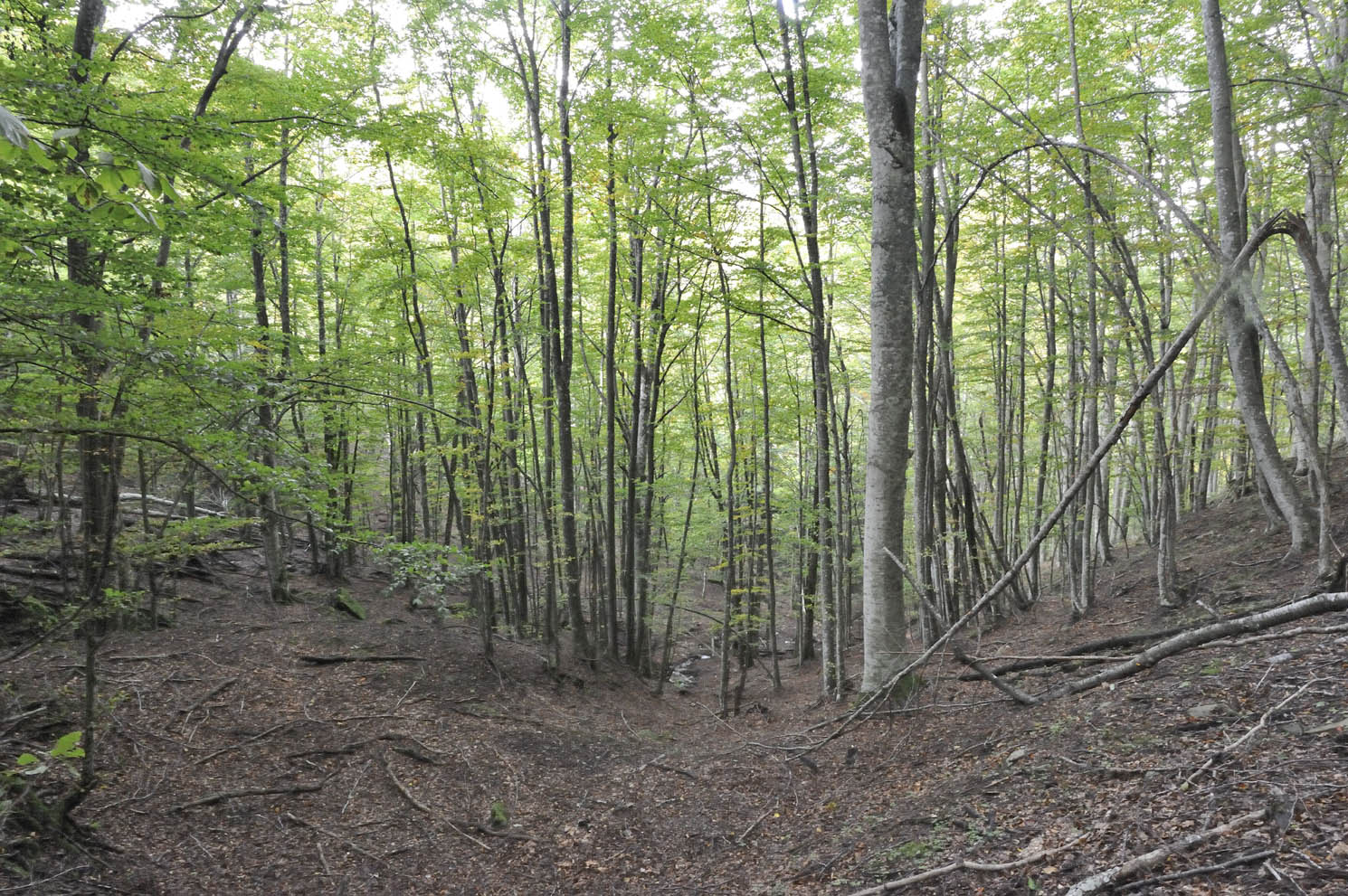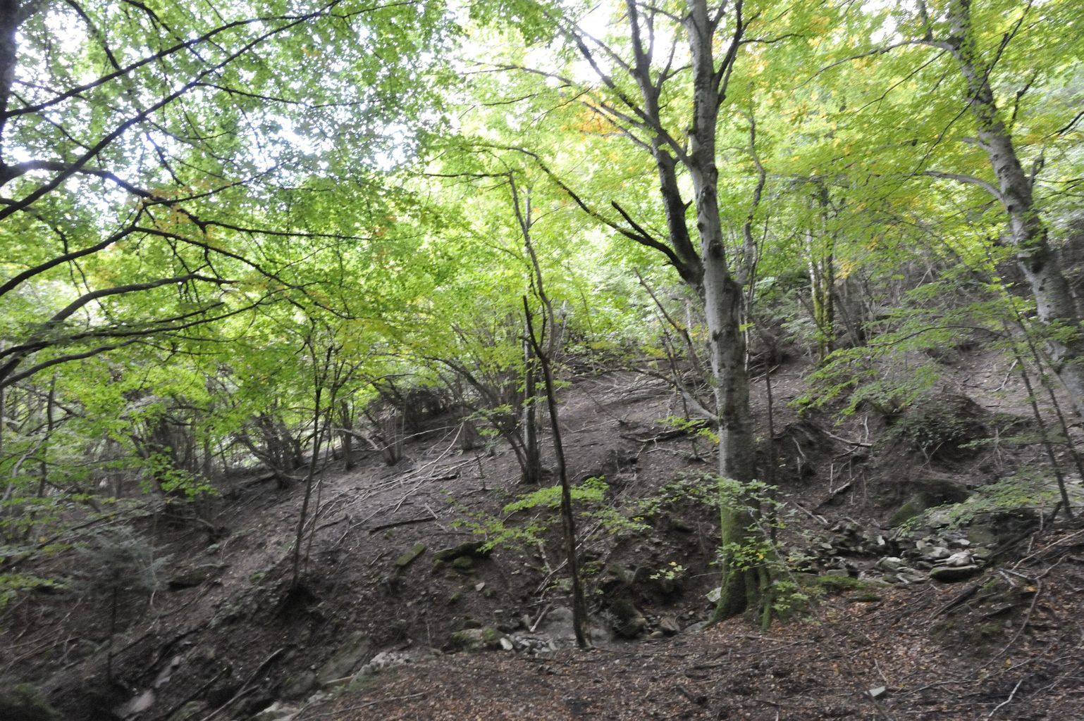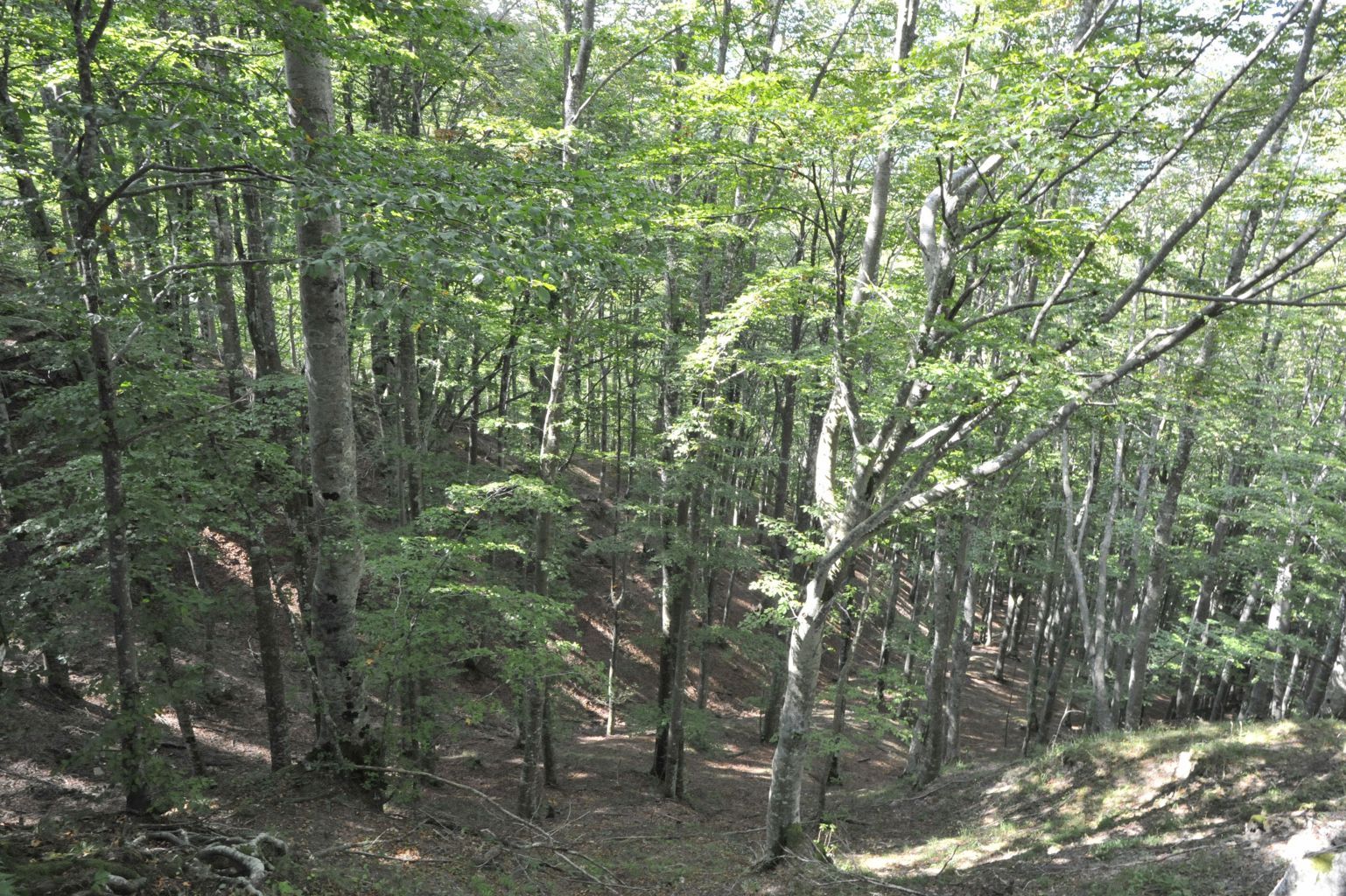 In questo tratto lo Spartiacque Appenninico mostra, a ridosso delle maggiori quote, fortissime pendenze modellate dall’erosione con formazione di profondi fossi e canaloni fortemente accidentati, talvolta con roccia affiorante, come il doppio rilievo di Poggio Rovino, con il canalone fortemente accidentato del Fosso del Rovino, che presenta quella vasta area adiacente di roccia affiorante con crollo dei banchi arenacei (cui probabilmente deve il caratteristico oronimo). Segue l’altrettanto caratteristico picco acuminato di Monte Cucco, toponimo considerato relitto linguistico dal latino cuccum, cucuzzolo, ma si pensa anche ad un‘origine onomatopeica dal latino cuculus, latino medievale cuccus, cuculo, romagnolo kòk (A. Polloni, cit.). Chiude la testata la Cima del Termine, rilievo anticamente detto Terminone, dove appunto “terminava” l’estensione della Selva di Casentino overo di Romagna che si chiama la selva di Strabatenzoli e Radiracoli donata (assegnata in perpetuo) tra 1380 e il 1442 dalla Repubblica Fiorentina all’Opera del Duomo di Firenze, all’epoca detto anche Le Rivolte di Bagno, infatti si “rivolgeva” bruscamente (data la morfologia improvvisamente impervia del sito) e dava inizio al tragitto in tale direzione. Al rialzarsi dei rilievi si alternano andamenti più lineari interrotti dalle selle dei Passi dei Cerrini, di Massella e dei Lupatti. Ai passi e alle incisioni dei crinali corrispondono i numerosi rami degli affluenti più montani del Bidente: oltre al Fosso del Rovino, già delle Capanne o Capannacce, con rami che si estendono anche al Passo della Crocina fino al Passo e Poggio della Bertesca, verso Est trovano origine il Fosso delle Ranocchie, lo stesso Bidente e il Fosso dei Segoni, già della Buca Prati o della Buca dei Preti, mentre i Fossi della Spiaggia o delle Spiagge e della Neve, che confluendo danno vita al Fosso della Bocca già della Buca, hanno origine da Cima del Termine e dal suddetto primo tratto del contrafforte principale fino allo stacco del Crinale del Finocchio. Intercalata alle incisioni vallive del reticolo idrografico emerge una trama di dorsali minori di vario impatto morfologico, alcune delle quali si proiettano più evidenti verso il fondovalle concentrandosi verso il sito dell’Eremo Nuovo, con pendenze mediamente ripide ma non tali da impedire la percorribilità di crinale. Tra esse la lunga dorsale dei Segoni che divide il Fosso dei Segoni dai Fossi della Spiaggia e della Bocca fino alla confluenza di quest’ultimo nel Bidente, sulla quale si trovano ancora tracce di antiche o trascorse percorrenze che si innestano sull’antica via (ancora rappresentata nel catasto moderno come S. Vic.le Eremo-Campo Rosso) che collegava l’Eremo Nuovo con La Buca attraversando il Bidente tramite una caratteristica pedanca (definizione tecnica I.G.M.) che mostra ancora i suoi resti, per poi varcare il crinale a Prato ai Grilli ed entrare nella valle del Fiume Savio. All’inospitalità dei luoghi faceva peraltro riscontro una ridottissima presenza di insediamenti. Nel bacino idrografico del Fosso dei Segoni si trovava il Poderaccio o Poderuccio; posto in dx idrografica all’altezza della confluenza del fosso nel Bidente, si hanno notizie dal 1560. Insediamenti anche abitativi geograficamente confinanti ed afferenti alla stessa area erano le Capanne e la Buca, di cui restano le “impronte edilizie”; del primo, posto in sx idrografica del Fosso del Rovino o delle Capanne, si hanno notizie fin dal 1642 ma sarebbe stato abbandonato già dai primi del ‘700 (cfr.: C. Bignami, A. Boattini, 2018, cit.); il secondo, posto alla confluenza tra i Fossi della Spiaggia e della Neve con origine del Fosso della Bocca, documentato fin dal 1631 in base ad un accurato elenco relativo ai beni dell’Opera del 1637 «1637 – Nota dei capi dei beni che l’opera è solita tenete al livellati in Romagna e Casentino e sono notati col medesimo ordine col quale fu di essi fatta menzione nella visita generale che ne fu fatta l’anno 1631: […] 64) Buca o Fossa, podere tenuto da redi di Riccardo Lollini » (A. Gabbrielli, E. Settesoldi, 1977, p. 412, cit.), da una relazione del 1763 risulta in fase di abbandono: «[…] Nella casa della Buca non v’abita alcuno et è annessa al Poderaccio per cui stando così succederà […] la rovina […]» (A. Gabbrielli, E. Settesoldi, 1977 , p. 440, cit.). Ad un riutilizzo abitativo fino al 1807 seguirà il definitivo abbandono, infatti nella descrizione dei confini del Contratto livellario tra l’Opera e il Monastero di Camaldoli del 1818, le case del Poderaccio e di Buca risultano già distrutte: «Tutta questa tenuta […] è composta dai seguenti terreni cioè […] 9° Un podere denominato il Poderaccio […] con casa da lavoratore stata bruciata di recente non esistendovi attualmente che le mura fracassate. Questo podere è composto dei seguenti terreni […] III° un tenimento di terre denominate la Buca […] nel detto luogo ci era una casetta oggi rovinata […]» (A. Gabbrielli, E. Settesoldi, 1977, pp. 466-468, cit.).