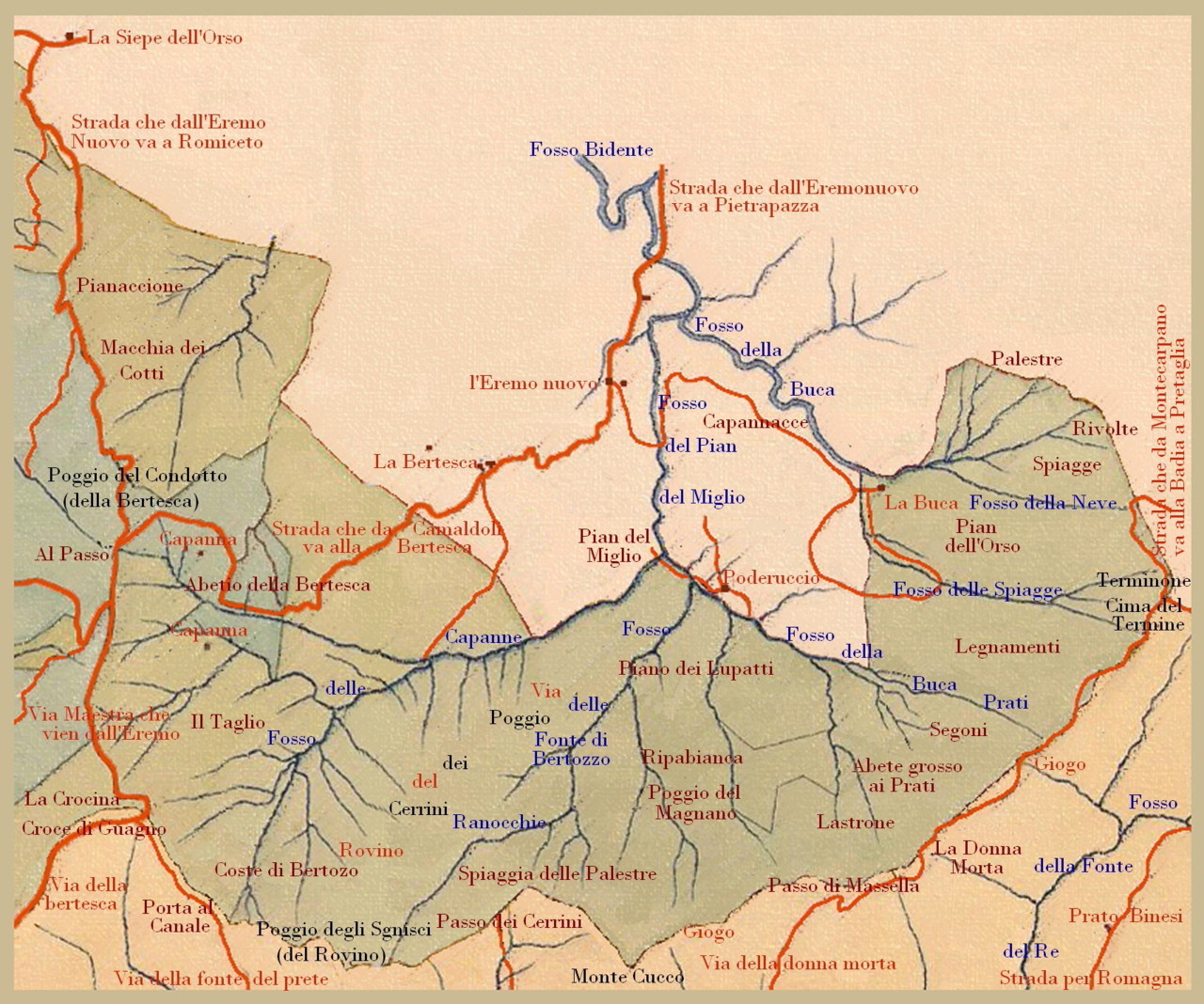 Ai passi e alle incisioni dei crinali corrispondono i numerosi rami degli affluenti più montani del Bidente: oltre al Fosso del Rovino, già delle Capanne o Capannacce, con rami che si estendono anche al Passo della Crocina fino al Passo e Poggio della Bertesca, verso Est trovano origine il Fosso delle Ranocchie, lo stesso Bidente e il Fosso dei Segoni, già della Buca Prati o della Buca dei Preti. I Fossi della Neve e della Spiaggia o delle Spiagge, che confluendo danno vita al Fosso della Bocca già della Buca, hanno origine da Cima del Termine e dal suddetto primo tratto del contrafforte principale fino allo stacco del Crinale del Finocchio, laddove si crea l’anfiteatro vallivo di un importante affluente ignoto del Fosso della Neve, luogo anticamente detto Palestre. L’idronimo Fosso della Neve corrisponde all’odierno tratto alto del Fosso della Bocca. Affluente noto del Fosso della Bocca è il Fosso dell’Eremo, dal ripidissimo anfiteatro vallivo incassato tra gli sproni del versante occidentale del Crinale del Finocchio, caratterizzati da estese stratificazioni affioranti. Intercalata alle incisioni vallive del reticolo idrografico emerge una trama di dorsali minori di vario impatto morfologico, alcune delle quali si proiettano più evidenti verso il fondovalle concentrandosi verso il sito dell’Eremo Nuovo, con pendenze mediamente ripide ma non tali da impedire la percorribilità di crinale. Tra esse la lunga dorsale dei Segoni che divide il Fosso dei Segoni dai Fossi della Spiaggia e della Bocca fino alla confluenza di quest’ultimo nel Bidente, sulla quale si trovano ancora tracce di antiche o trascorse percorrenze che si innestano sull’antica via (ancora rappresentata nel catasto moderno come S. Vic.le Eremo-Campo Rosso) che collegava l’Eremo Nuovo con La Buca attraversando il Bidente tramite una caratteristica pedanca (definizione tecnica I.G.M.) che mostra ancora i suoi resti, per poi varcare il crinale a Prato ai Grilli ed entrare nella valle del Fiume Savio. All’inospitalità dei luoghi faceva peraltro riscontro una ridottissima presenza di insediamenti. Nel bacino idrografico del Fosso della Bocca si trovavano la citata La Buca, il Finocchio e Casa di Bastiano, mentre insediamenti anche abitativi geograficamente confinanti ed afferenti alla stessa area erano il Poderaccio e le Capanne: di tutti restano le “impronte edilizie”. La Buca, posta subito a ridosso della confluenza tra i Fossi della Neve e della Spiaggia, è documentata fin dal 1631 in base ad un accurato elenco relativo ai beni dell’Opera del 1637 «1637 – Nota dei capi dei beni che l’opera è solita tenete al livellati in Romagna e Casentino e sono notati col medesimo ordine col quale fu di essi fatta menzione nella visita generale che ne fu fatta l’anno 1631: […] 64) Buca o Fossa, podere tenuto da redi di Riccardo Lollini […]» (A. Gabbrielli, E. Settesoldi, 1977, p. 412, cit.); da una relazione del 1763 risulta già in fase di abbandono: «[…] Nella casa della Buca non v’abita alcuno et è annessa al Poderaccio per cui stando così succederà […] la rovina […]» (A. Gabbrielli, E. Settesoldi, 1977 , p. 440, cit.). Ad un riutilizzo abitativo fino al 1807 seguirà il definitivo abbandono, infatti nella descrizione dei confini del Contratto livellario tra l’Opera e il Monastero di Camaldoli del 1818, le case del Poderaccio e de La Buca risultano già distrutte: «Tutta questa tenuta […] è composta dai seguenti terreni cioè […] 9° Un podere denominato il Poderaccio […] con casa da lavoratore stata bruciata di recente non esistendovi attualmente che le mura fracassate. Questo podere è composto dei seguenti terreni […] III° un tenimento di terre denominate la Buca […] nel detto luogo ci era una casetta oggi rovinata […]» (A. Gabbrielli, E. Settesoldi, 1977, pp. 466-468, cit.). Il Finocchio e Casa di Bastiano o Poderino del Finocchio sono due poderi adiacenti documentati fin dal 1560, corrispondenti a due fabbricati anonimamente riportati dal Catasto Toscano del 1826-34, utile per il reperimento dei loro resti. Il primo insediamento si trovava su uno sprone che si dirama dal crinale cui dà il nome, delimitante l’anfiteatro del Fosso dell’Eremo, dove un terrazzo morfologico ha consentito la formazione di un’area prativa, probabilmente utile al pascolo di qualche capo di bestiame, sul cui bordo superiore, oggi circondato da cerri, carpini e qualche pino, sorgeva la casa, di cui si individua l’impronta e si riconoscono gli scarsi resti lapidei che hanno resistito alle intemperie di un luogo tanto impervio, che comunque risulta abitato fino al 1816. L’attribuzione toponimica è possibile grazie alla descrizione dei confini del podere, posto tra quelli dell’Eremo Nuovo ad Ovest e della Ciardella a Nord, oltre che limitato a Sud dal Fosso della Bocca e ad Est dal Crinale del Finocchio (cfr.: C. Bignami, A. Boattini, 2018, cit., che però nella mappa allegata al testo indica una collocazione del tutto incongruente, infatti ben lontana dal Fosso della Bocca). Alla Casa di Bastiano, che sarebbe esistita per poco più di un solo secolo, può essere attribuito l’accumulo di pietrame, richiamante un’impronta edilizia, posto su un terrazzamento nascosto nella boscaglia della vallecola adiacente allo sprone suddetto, attraversata da un fossatello e da collegata da un sentiero con l’altro podere, rispetto al quale si trova ad un dislivello inferiore di circa 50 m, così corrispondendo sia al riporto del Catasto Toscano sia alle descrizioni documentali (cfr.: C. Bignami, A. Boattini, 2018, cit., che però non fornisce ipotesi localizzative). Il Poderaccio, posto in dx idrografica all’altezza della confluenza del Fosso dei Segoni nel Bidente, risulta documentato fin dal 1560. De le Capanne, posto in sx idrografica del Fosso del Rovino o delle Capanne presso lo sbocco nel Bidente, nel sito anticamente detto Pian del Miglio, si hanno notizie fin dal 1642 ma 