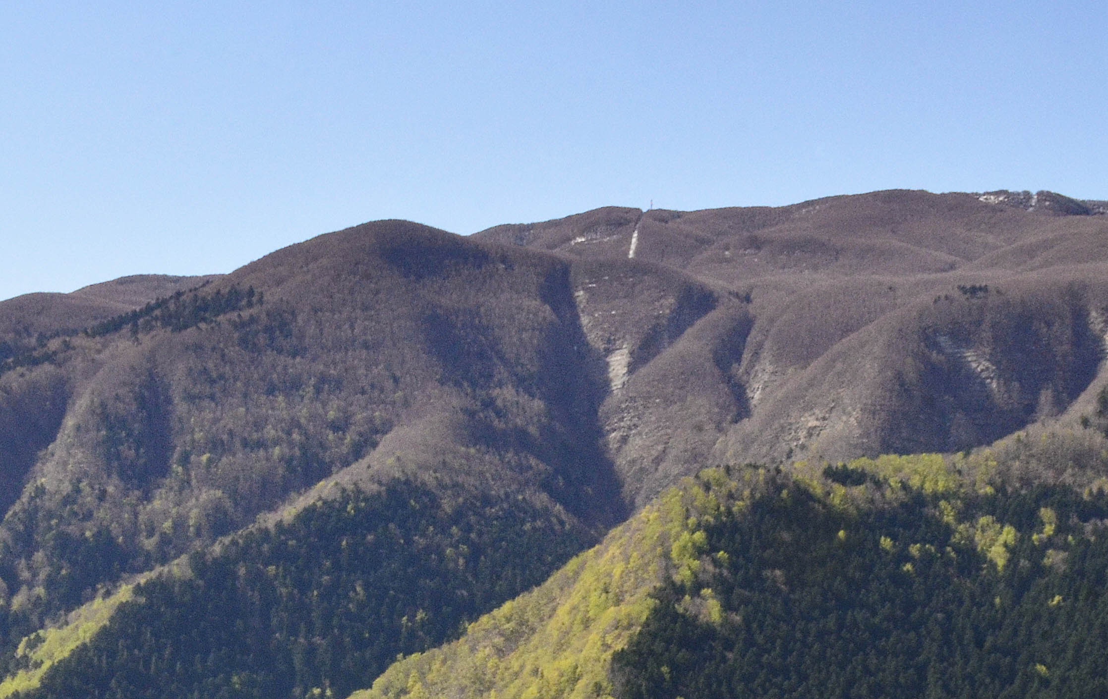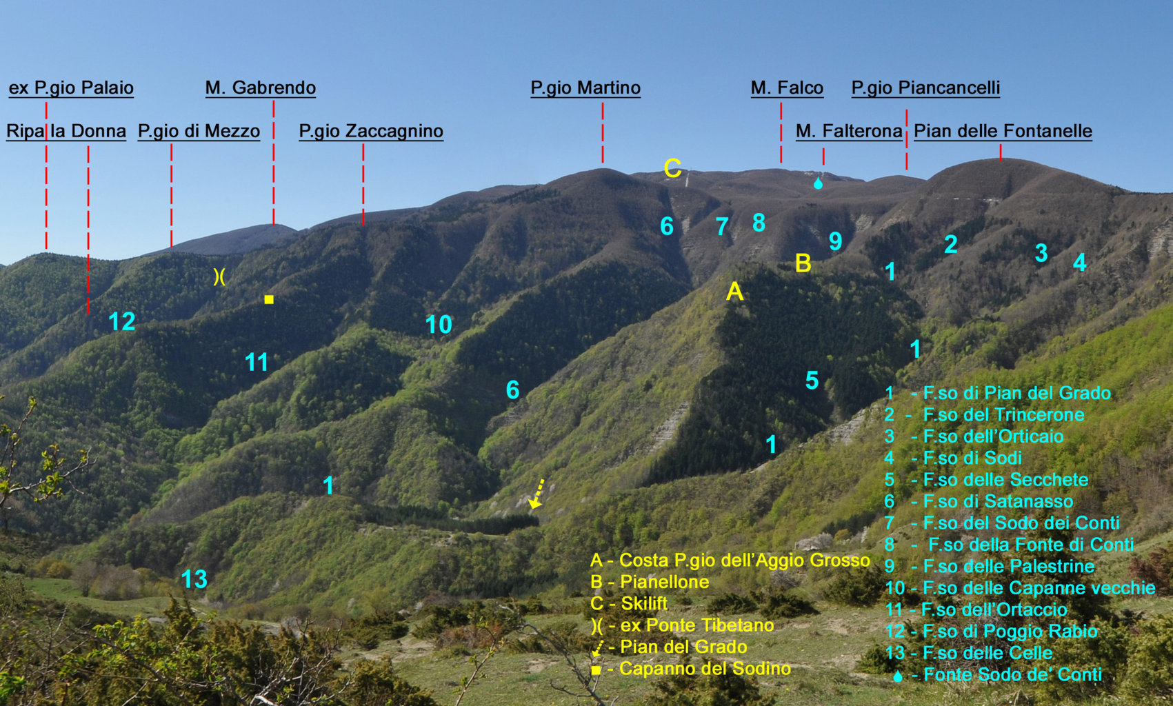 006/009 - Dal Sentiero degli Alpini (SA 301 CAI) presso Poggio Bini, panoramica su uno dei tratti più impervi del versante appenninico, con particolare dove si nota lo skilift e indice fotografico (16/04/16).