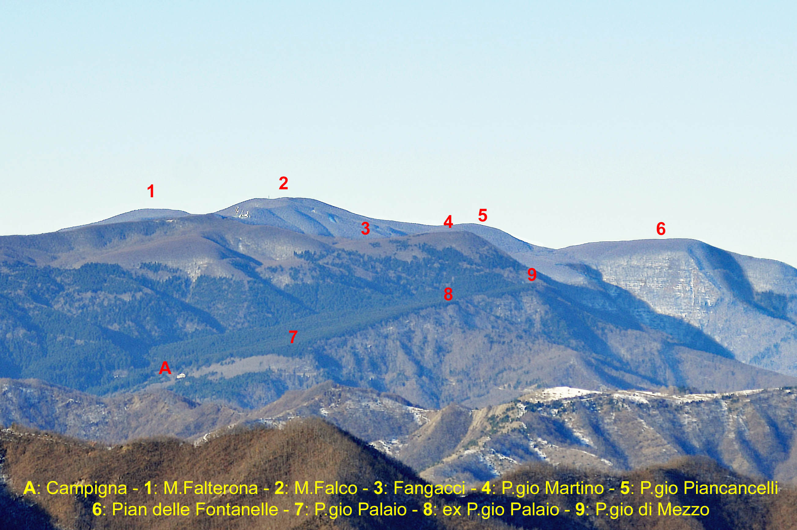 001 – 002 – 003 – Dal Monte Piano si può avere una delle più ampie viste dell’intero spartiacque appenninico che si innalza oltre il contrafforte secondario che separa le Valli del Bidente di Pietrapazza (in p.p.) e di Ridràcoli; si riconoscono le due vette maggiori dei Monti Falterona e Falco ma grazie all'indice fotografico si riesce a distinguere anche la sella di Fangacci (01/01/12).