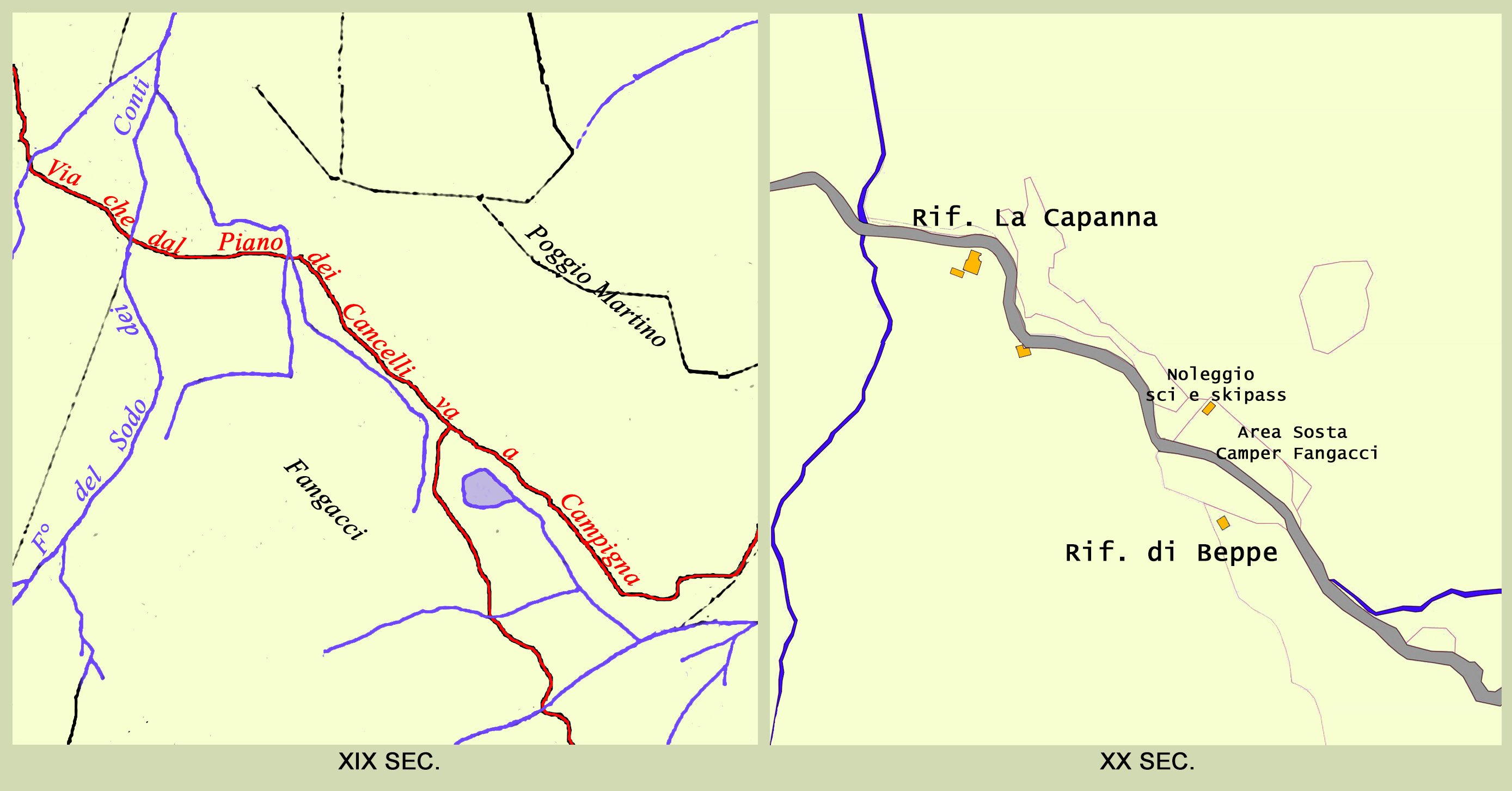 Il comprensorio di Campigna fu interessato dall’infrastrutturazione turistica postbellica, quando fortunatamente fu evitato lo «[…] scempio urbanistico minacciato nelle due località di Campigna e Badia Prataglia.» (F. Clauser, 2016, p. 72, cit.), diretto «[…] ad ottenere una ben più alta e deleteria incidenza di strade, ville e negozi all’interno della foresta (richiesta della creazione di un villaggio turistico in Campigna).» (P. Bronchi, 1985, p. 109, cit.), con la costruzione della prima pista sciistica dal Monte Gabrendo ai Prati della Burraia, risalente agli anni 1952/55, cui seguirono l’impianto di risalita collegato alla prima stazione invernale del luogo, oggi Chalet Burraia, struttura nata negli Anni ’30 come servizio per escursioni appenniniche (impianto poi abbandonato e definitivamente smantellato nel 2016 con riqualificazione dell’area), cui seguì nel 1958 l’impianto Sodo dei Conti/Fangacci. Nei primi Anni Sessanta anche a Campigna un modesto skilift consentiva di sciare lungo la pista che scende a Villaneta. Oltre allo Chalet, altri rifugi tutt’ora operanti ed edificati come servizio sia degli impianti sciistici che del turismo montano sono il citato CAI Città di Forlì posto al margine dei prati, edificato nel 1974 in corrispondenza di un fabbricato documentato dalla Carta Geometrica del 1850 con il toponimo Capanna, e il Rifugio La Capanna, con lo skilift che raggiunge il crinale nei pressi di Sodo dei Conti a circa 300 m dall’innesto della Pista del Lupo. Altri impianti sciistici odierni sono le piste di fondo e lo snow park di Fangacci, presso il quale si trova il moderno Rifugio di Beppe (attrezzato per le grigliate al coperto), e il Rifugio del Sano, anch’esso probabilmente recente e noto in quanto citato nelle guide degli scorsi Anni ’80: «Dall'albergo Scoiattolo si prende la deviazione per la strada statale, raggiuntala, si prende di fronte dove ha inizio lo stradello forestale contrassegnato dal segnavia N° 26, che attraversa tutta la foresta di abete. Si sale a destra del fosso dell'Abetio poi ad una biforcazione (30 min.) si piega a sinistra per raggiungere il rifugio del Sano (40 min.) per poi scendere al fosso dell'Abetio in località Ponticino (50 min.)» (O. Bandini, G. Casadei, G. Merendi, 1986, p. 108, cit.). Il rifugio, ancora rappresentato (senza toponimo) nella cartografia escursionistica benché non più esistente, è stato evidentemente rimosso, con ripristino dei luoghi: si trovava presso il Passo di Giuntino, antico toponimo della sella tra il Poggio di Zaccagnino e il Poggio di Mezzo.