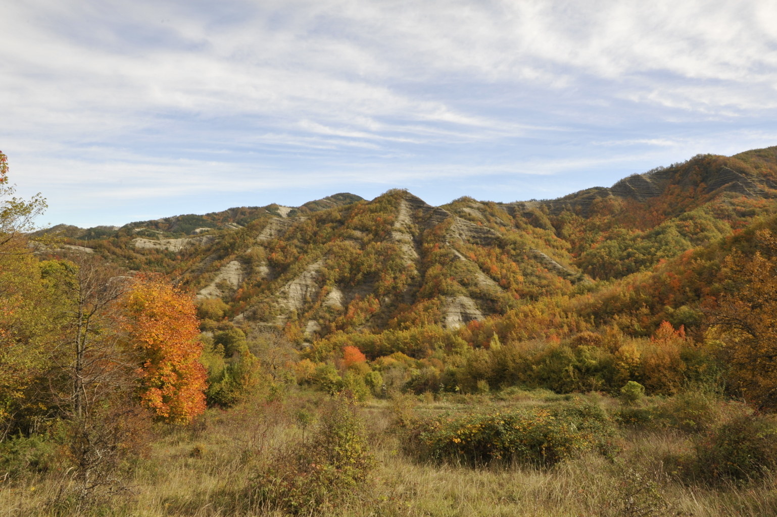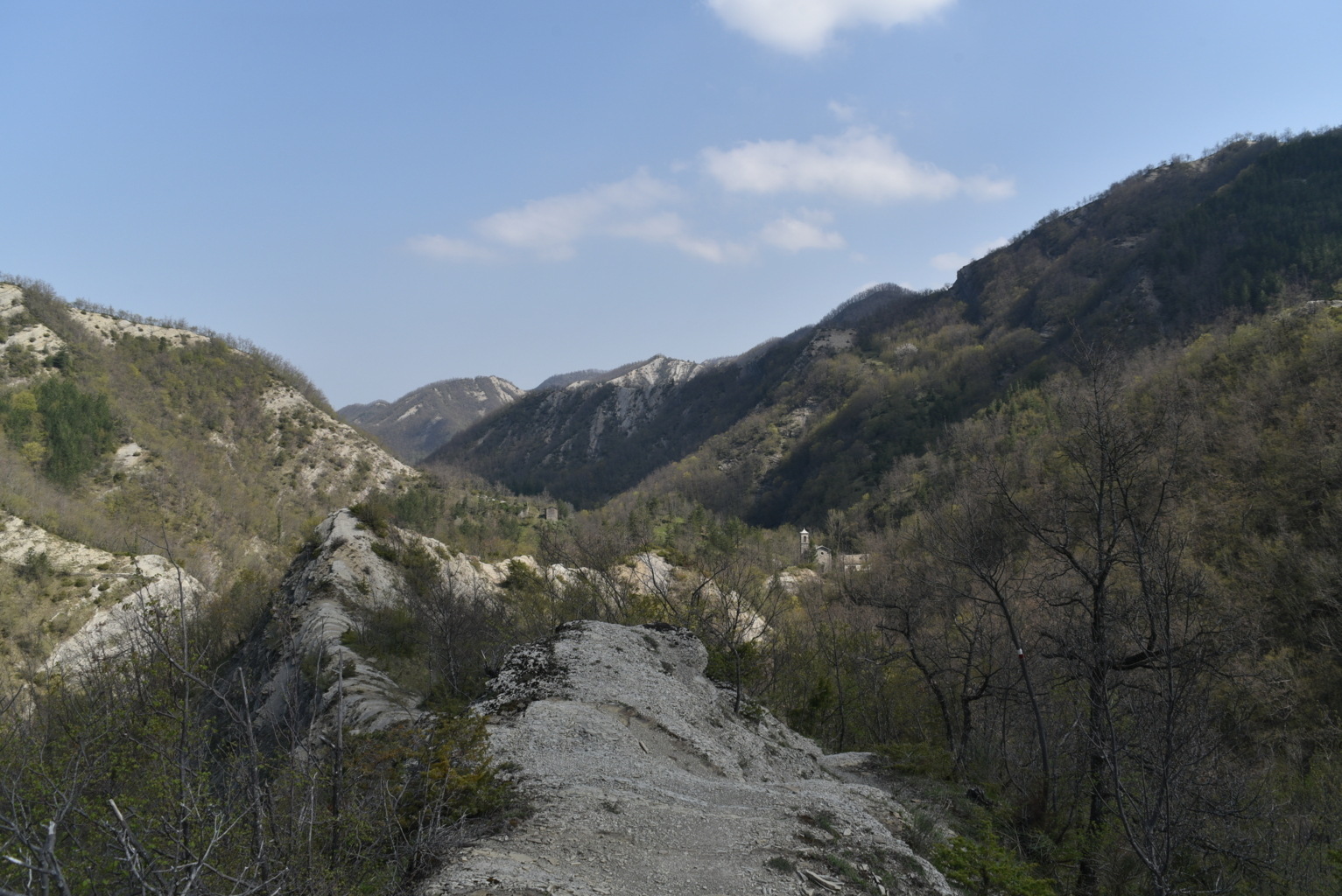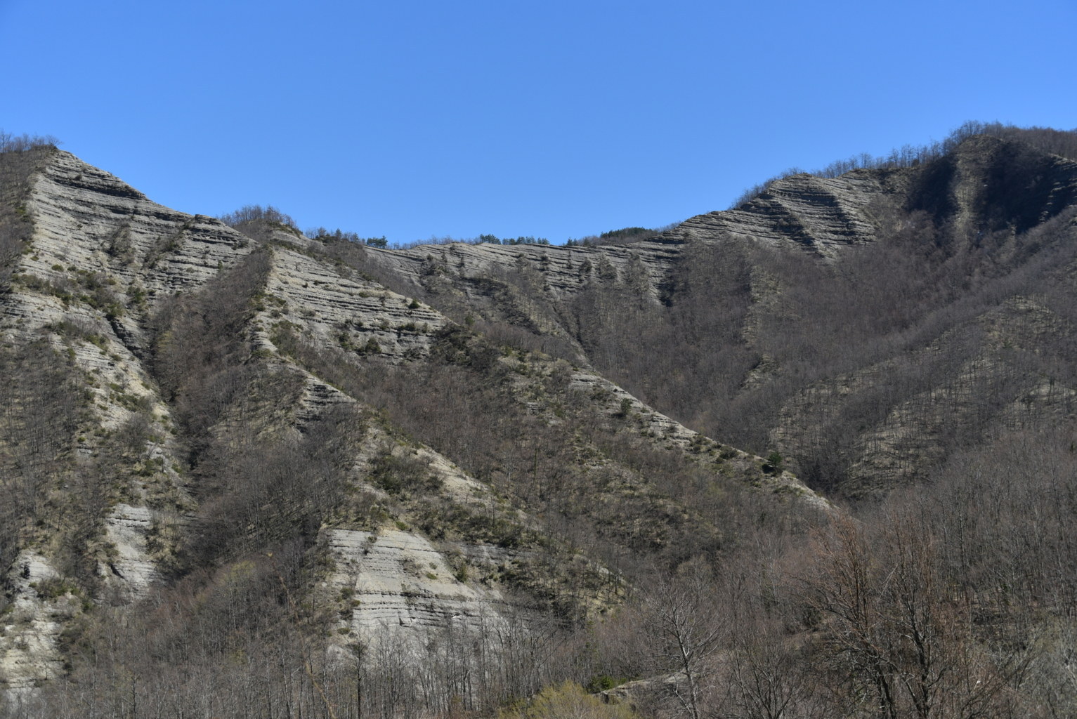 Probabilmente all’interno di uno dei primordiali avvallamenti sopra descritti potrebbe essersi originato l’assetto orografico dell’Appennino tosco-romagnolo e quindi attinente all’Alta Valle del Fiume Bidente, quale parte del sistema montano accennato da Mini nella citazione sopra riportata, laddove la catena appenninica presenta evidenti inflessioni alle quali si accompagna un vario orientamento delle diramazioni montuose che si staccano ad oriente dividendo i sistemi vallivi, con una regolarità morfologica che conferma quanto siano geologicamente recenti, a differenza dei territori circostanti, specie toscani, dove le catene montane sono disposte nelle più varie direzioni con datazioni di rocce che possono risalire fino a 300 milioni di anni BP, ricadendo pertanto nel Paleozoico.