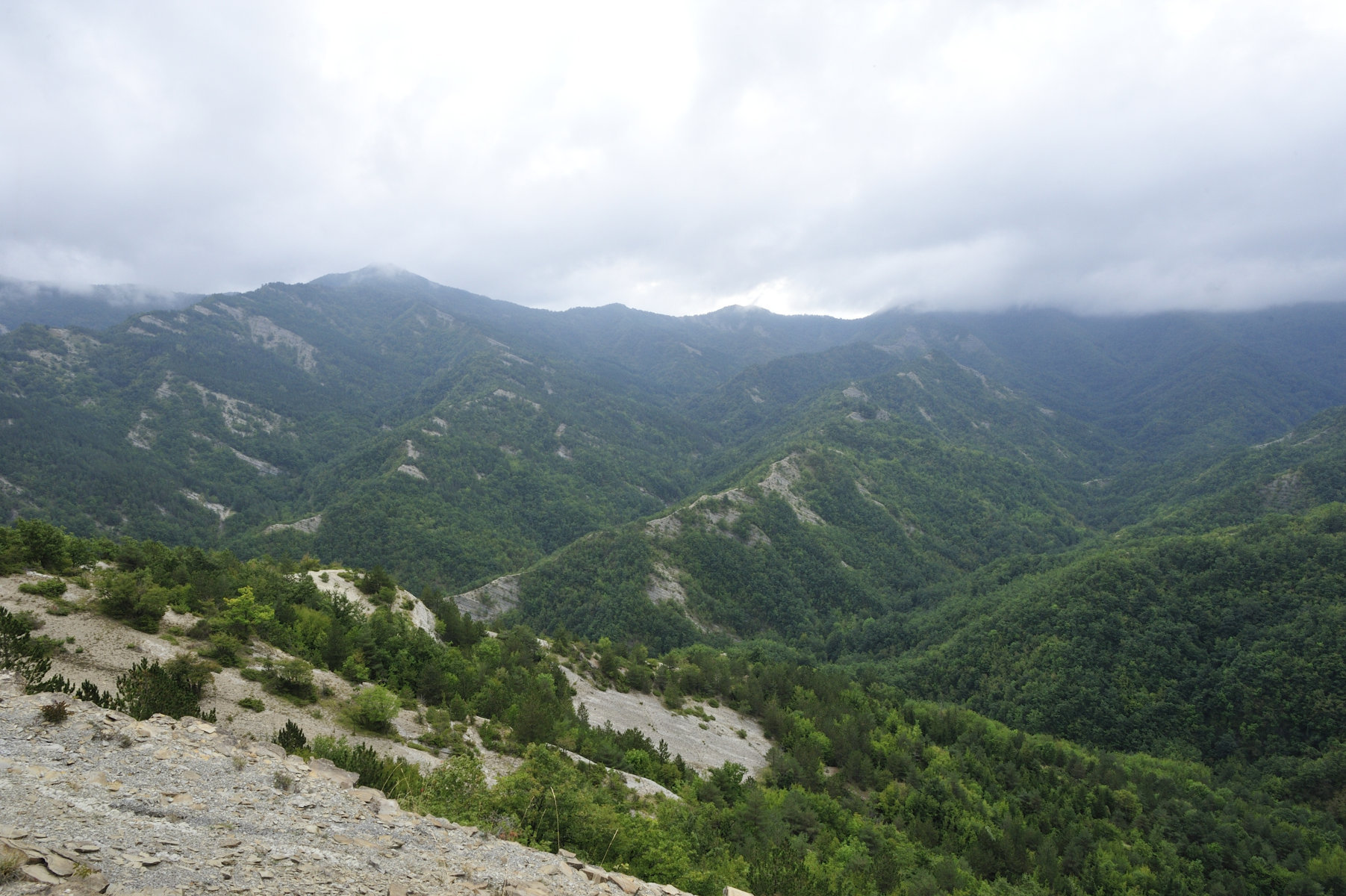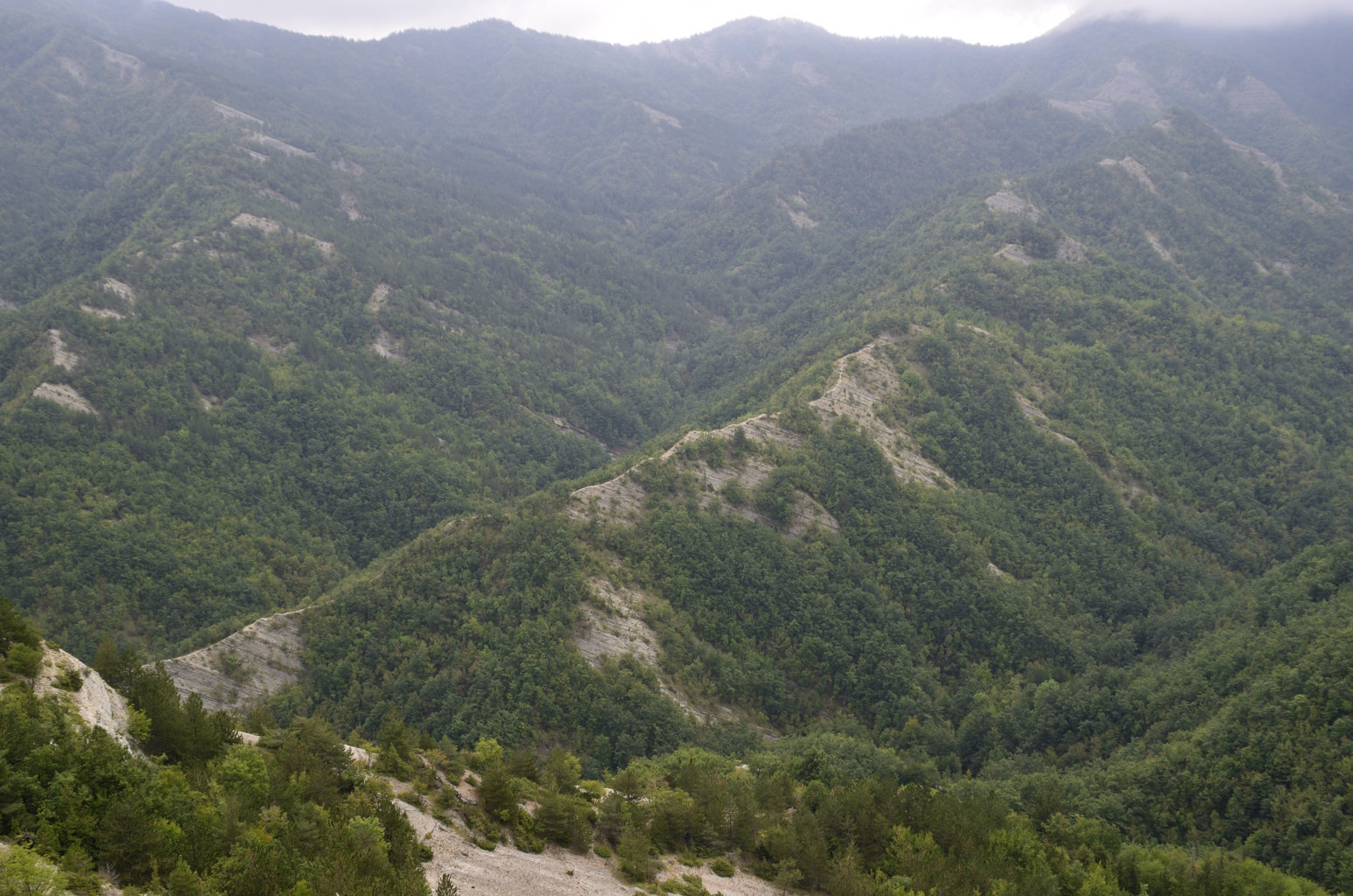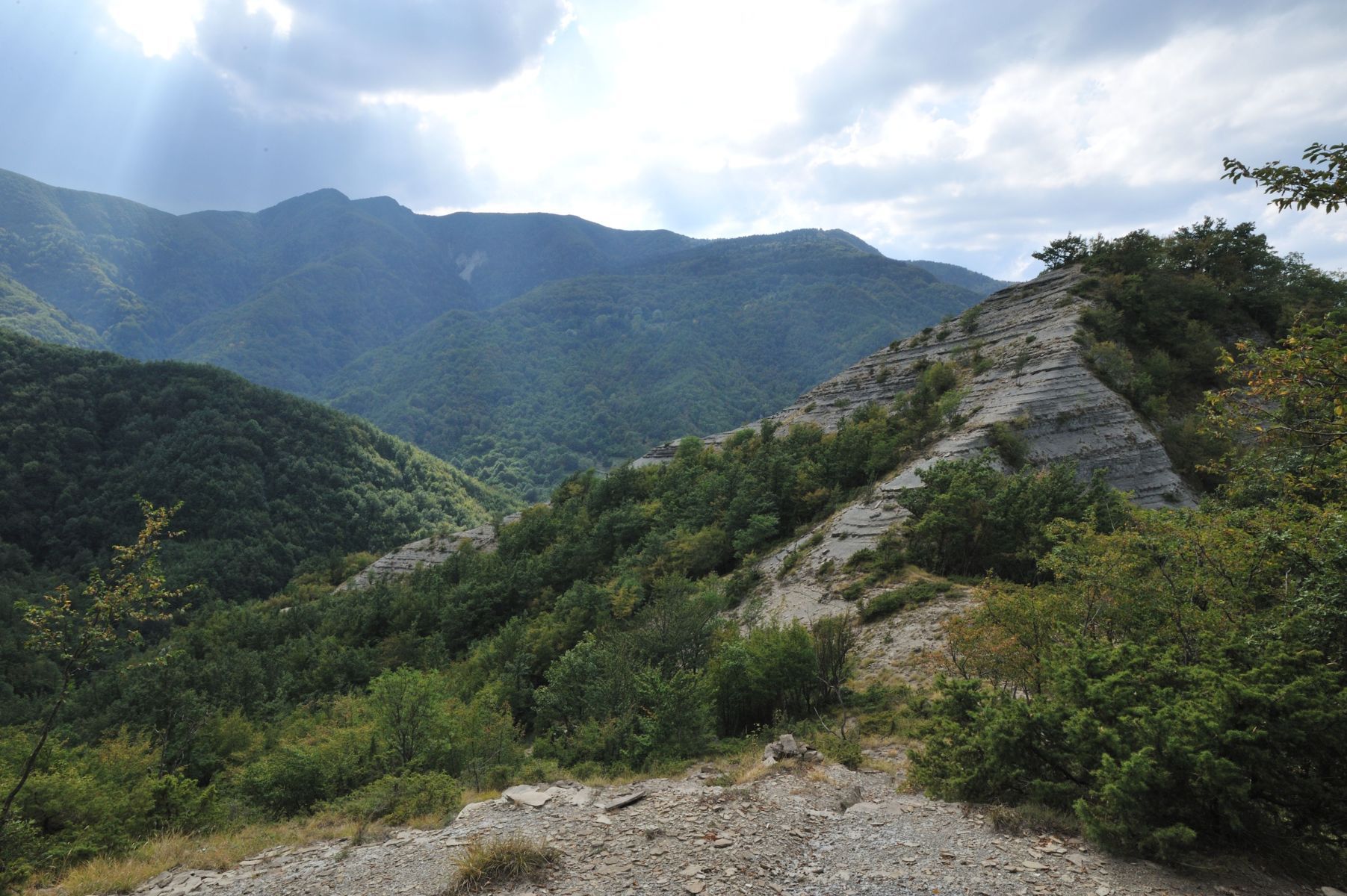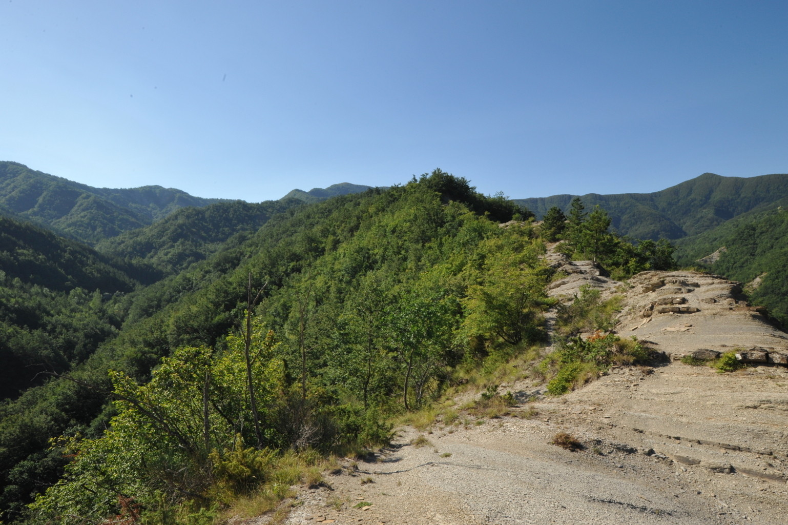 00b1 - 00b2 - 00b3 – Dal sent. 205, che dalla S.F. del Cancellino scende alla Bertesca, scorcio sull’alta valle del Bidente di Pietrapazza e l’inizio del contrafforte principale che si stacca da Cima del Termine con particolare delle Rivolte di Bagno che compiono l’ulteriore svolta delle Palestre dove inizia il Raggio del Finocchio (24/08/11 - 16/07/12).