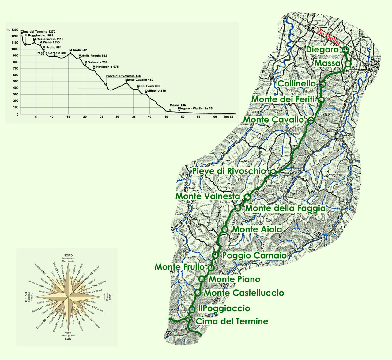 Il contrafforte principale SE si stacca da Cima del Termine, presso il Passo dei Mandrioli, diretto verso Cesena. Subito precipita tramite le Rivolte di Bagno fino al Poggiaccio proseguendo più regolare con l’alternanza dei modesti rialzamenti dei Monti Carpano e Castelluccio e la sella di Macchia del Cacio fino al Monte Piano (che offre una panoramica completa dello Spartiacque). Prosegue con il Monte Frullo, il Passo e Colle del Carnaio, i Monti Aiola, Calbano, della Faggia, Valnesta, Altello, Navacchio, gli attraversamenti di S. Stefano, Rivoschio e S. Matteo cui seguono i Monti Cavallo, della Rovere o dei Feriti, i Colli di Collinello, Madonna di Cerbiano e di Bracciano, infine raggiunge Casa Tomba, Massa e Monticino «[…] per finire sulla via Emilia presso Diegaro.» (P. Zangheri, 1961, rist.anast. 1989, p. 16, cit.) dopo circa 49 km.