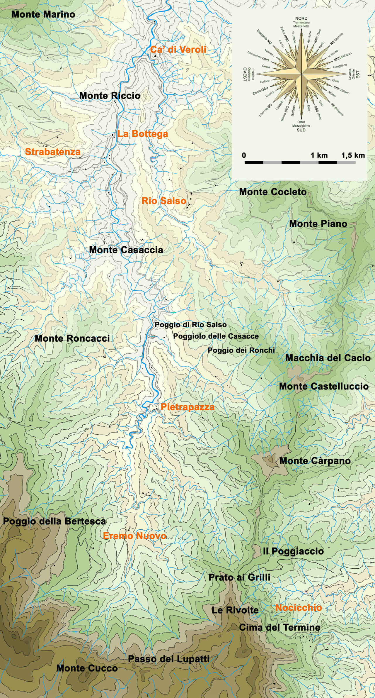 Schematizzando, la linea del crinale appenninico ai due estremi del tratto tosco-romagnolo, in coincidenza del Passo della Futa e del Passo di Viamaggio, presenta due nette inflessioni dove si modifica la direzione di sviluppo dello Spartiacque rispetto ai tratti precedente e successivo. Anche i contrafforti che da esso si distaccano proiettandosi verso l’area padana presentano un diverso orientamento a seconda del rispettivo tratto di origine: «[…] il crinale appenninico della nostra Provincia (e della Romagna) ha la direzione pressoché esatta da NO a SE […] hanno […] orientamento, quasi esatto, N 45° E, i contrafforti (e quindi le valli interposte) del territorio della Provincia di Forlì e del resto della Romagna. […] tale direzione non continua uniforme fino a raggiungere le ultime propaggini dei contrafforti stessi verso la pianura, e cambia invece alla distanza di 25-35 chilometri dalla dorsale, per piegare verso la direzione N 25° E […] passando progressivamente a N […]» (P. Zangheri, 1961, rist.anast. 1989, pp. 9, 59 cit.). Queste serie di rupi dai profili spesso frastagliati per la velocità del disfacimento roccioso che si snodano come un bastione naturale tra le valli denominate contrafforti terminano nella parte più bassa con uno o più sproni mentre le loro zone apicali fungenti da spartiacque sono dette crinali, termine che comunemente viene esteso allo stesso rilievo cui appartengono. Nei documenti storici per indicare i crinali, specie se costituenti elementi morfologici evidenti del territorio era spesso utilizzato il termine radium, raggio, forse in quanto netti e lineari (come quelli solari), allorquando erano parte di un itinerario (che consentiva collegamenti più diretti e rapidi tra luoghi altrimenti raggiungibili tramite lunghi tragitti) e/o costituenti confine di un’area. Per rilevanza o consuetudine a volte il termine diviene esso stesso toponimo o ne fa parte (Il Raggio, Raggio del Finocchio, Maestà del Raggio, Raggio alle Secche, Raggio dei Picchi, Raggio Grosso, Raggio Lungo, Raggio Mozzo, Fosso del Raggio, Raggio di Sopra, etc.).