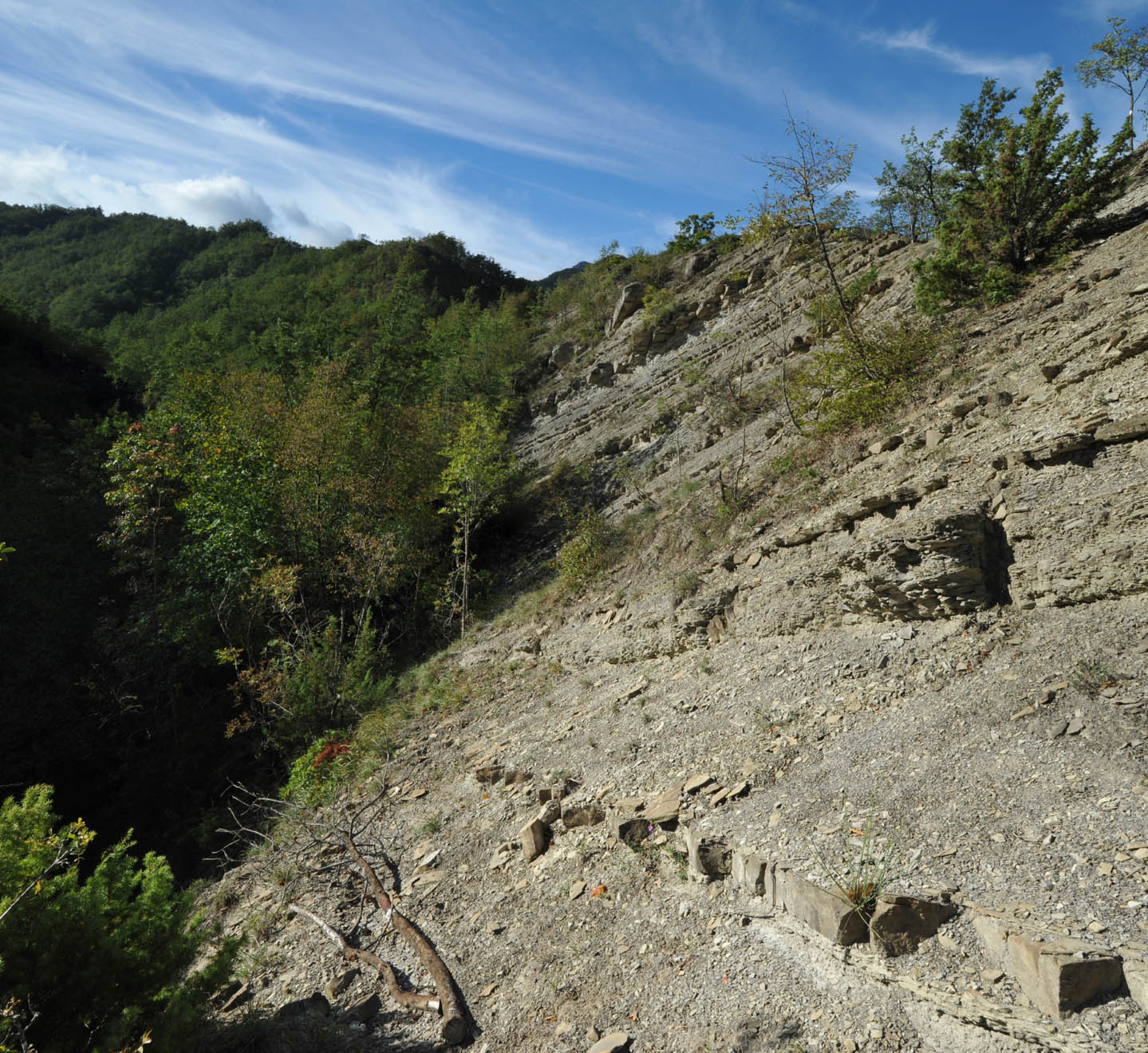 Il tratto di Spartiacque pertinente all’ambito descritto corre su altitudini tra le più elevate dell’Appennino forlivese, minime poco inferiori ai m. 1300 e massime fino ai m. 1500-1650, con abbassamenti in corrispondenza dei valichi e rialzamenti in coincidenza con i nodi montani da cui si distaccano le diramazioni montuose. L’inclinazione degli strati, immersi a SO, spiega la ripidità dei versanti esposti a settentrione della Bastionata di Campigna-Mandrioli, dove le pendenze, mediamente pari al 35%, raggiungono acclività del 70-100%, dando alla montagna il noto aspetto di imponenza e invalicabilità, con pareti evidenzianti la stratigrafia “a reggipoggio” modellata dall’erosione e la formazione di canaloni fortemente accidentati, con distacco detritico e lacerazioni della copertura forestale. A tale asprezza morfologica si contrappone la generale morbidità del crinale dovuta alla lentezza dell’alterazione delle bancate arenacee, la cui superficie coincide, appunto, con quella della stratificazione.