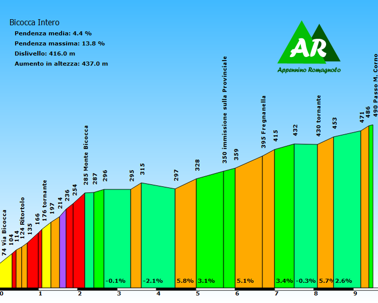 Alternativa è la strada della Bicocca - da Brisighella seguire la provinciale 67 con direzione Sarna - superato il bivio che conduce alle terme e il ponte sulla destra si trova la via Bicocca - I primi due km (vedi qui sotto lo sviluppo sono molto impegnativi, pendenza media 10% e lunghi tratti al 12-15% - Superato questo scalino naturale si percorrre un lungo crinela in saliscendi che in circa 4 km va a congiungersi con la provinciale che provenendo dallo stabilimento termale conduce al passo.
