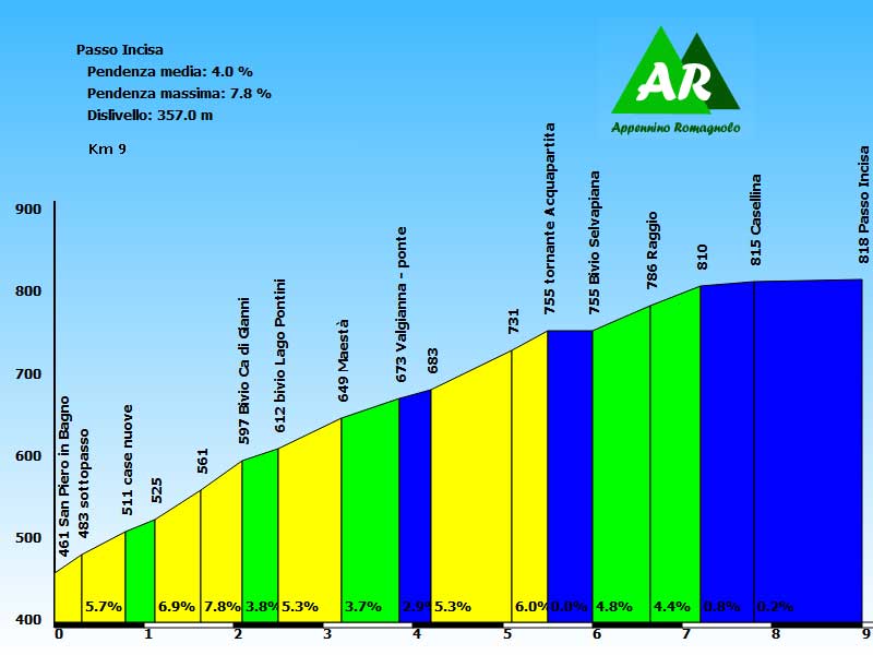 DaSan Piero in Bagno al passo Km 9 pendenza media 4,10%, senza punte eccessive, la pendenza difficilmente supera il 7%