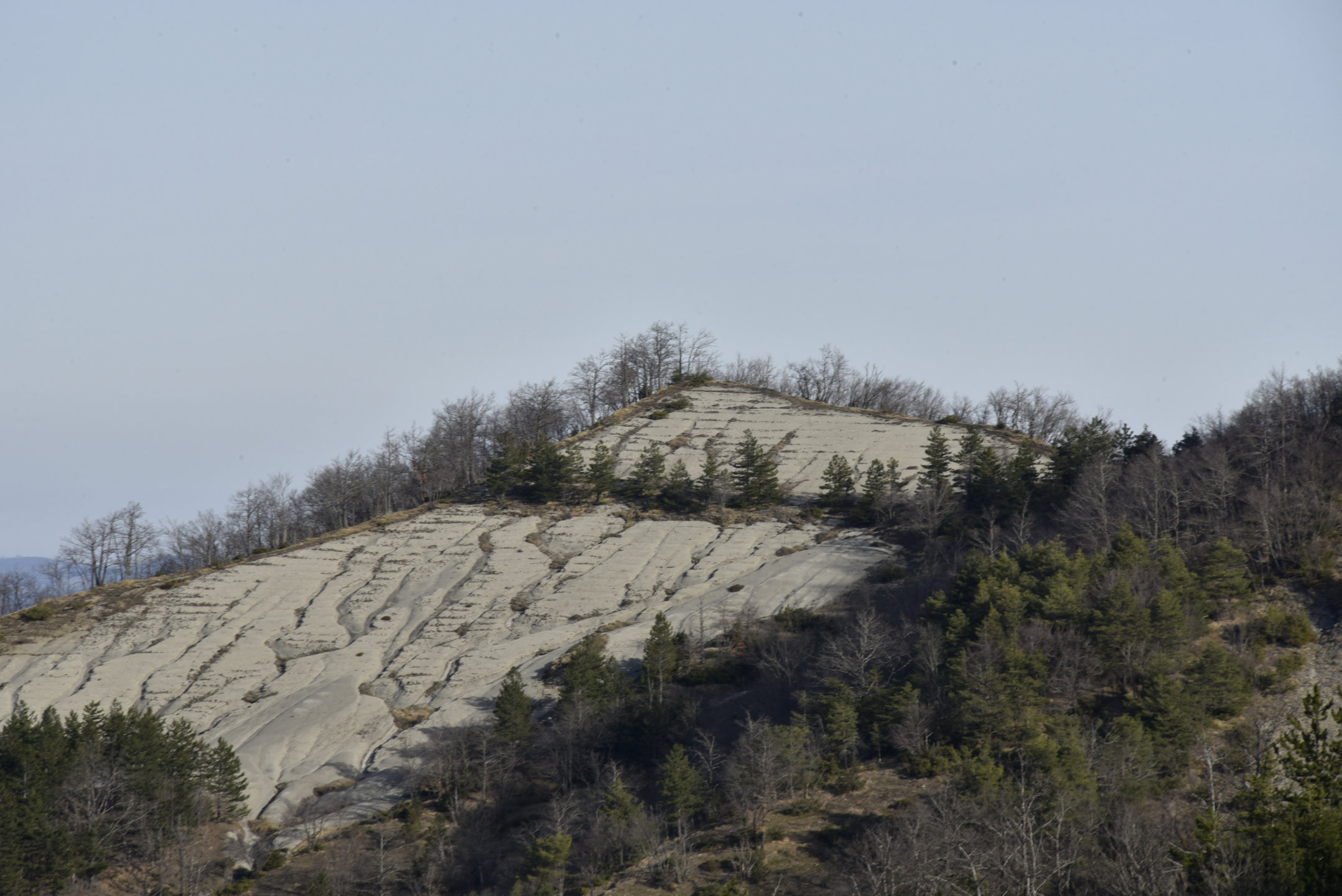 00h16/00h24 - Dalla pista che lo aggira (instabilizzando il versante), sent. 201, vedute del Càrpano da N e da NE, inciso dai primi rami del Fosso della Casaccia (26/08/16 - 11/04/22 – 26/04/22).