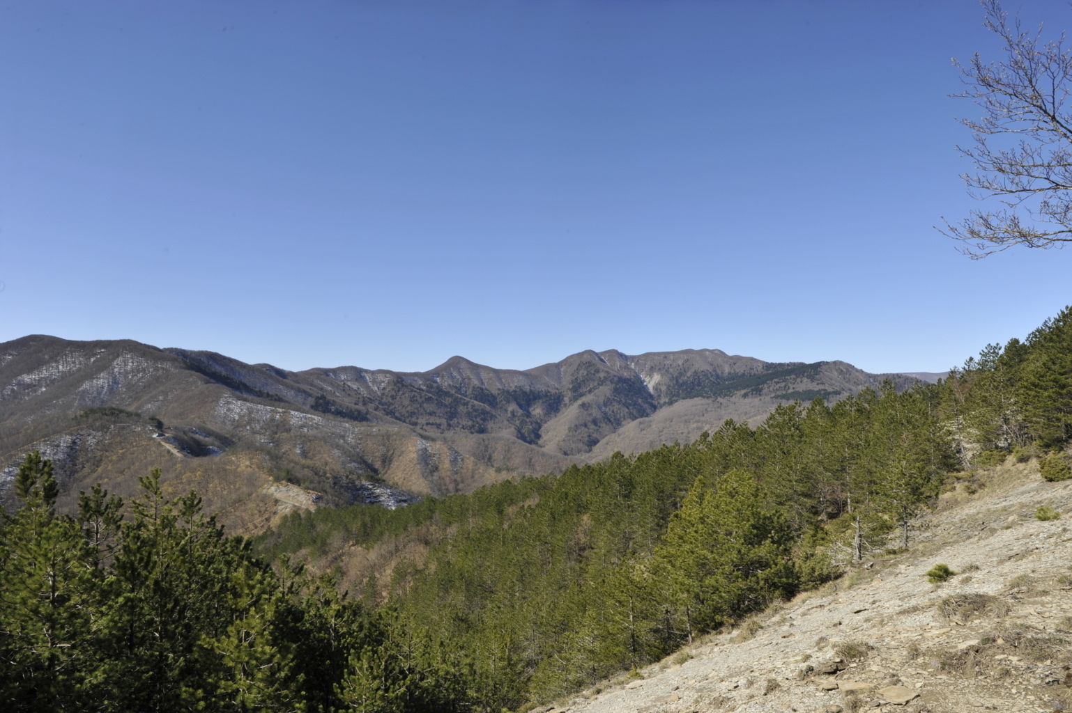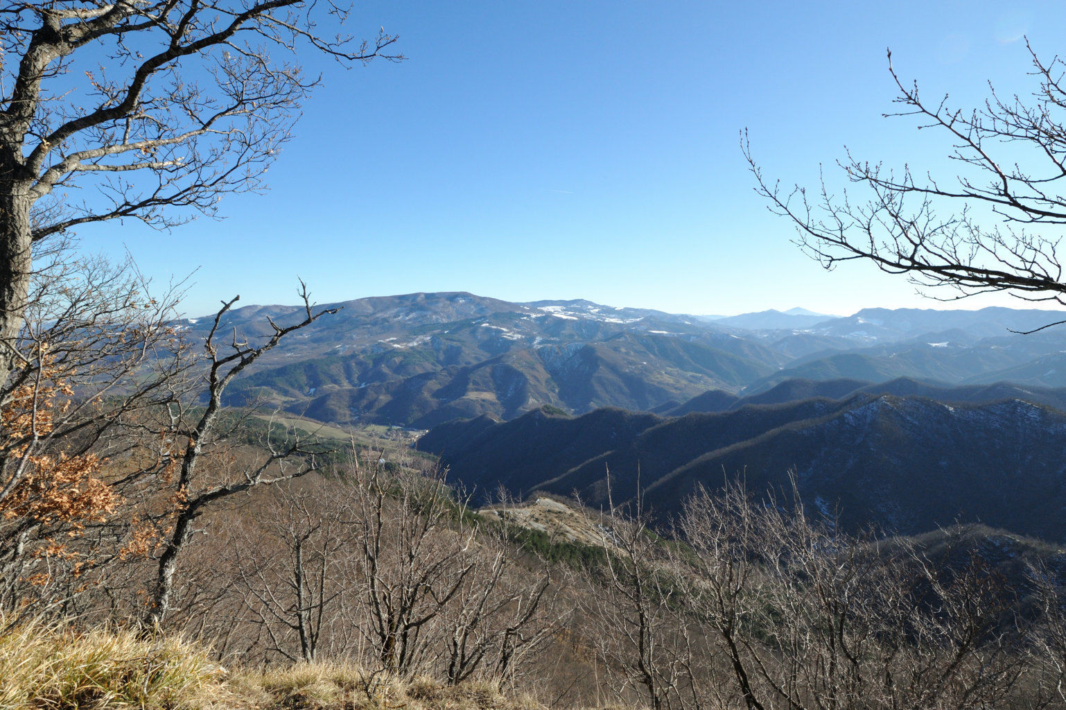 00b1 - Dalla dorsale di separazione tra le valli dei Fosso Fondo Rignone e del Vallone-dei Poderini, già Raggio di Valprandola e Raggio da Rignuno o di Rignone, veduta del tratto di contrafforte con i nodi tettonici dei Monti Càrpano e Castelluccio e delle dorsali che si distaccano, tra cui i Crinali delle Graticce e del Finocchio (28/03/22).