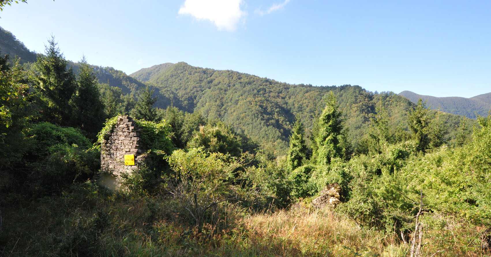 00c1 - 00c2 - 00c3 – Dai prati della Bertesca, tra i picchi del Monte Càrpano e del Poggiaccio si nota l’alta valle del Fosso di Susinello e, nella vista ravvicinata, l’area poderale dell’insediamento topico in parte in corso di rinaturalizzazione spontanea dove non ricoperta dall’abetina (24/08/11).