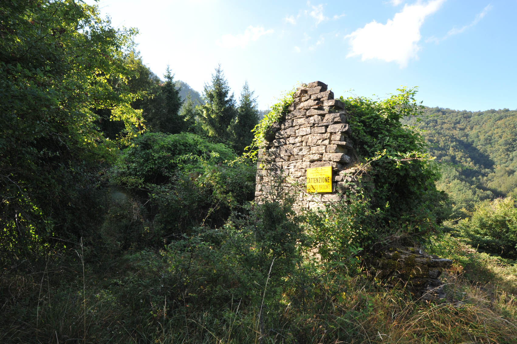 Le alienazioni di quest’area in effetti, entro la fine del secolo, risultano ormai avvenute ed i poderi dotati di abitazione e relativi annessi già da parte dei primi proprietari privati. Susinello, posto sul pendio instabile di una breve dorsale generata dal tratto di contrafforte principale, a circa 130 m di dislivello sotto il viadotto del Poggiaccio, risulta posseduto ed abitato già un paio d’anni dopo l’inventario dell’Opera, così intorno al 1560 ed entro la fine del secolo contava due case, con le aree poderali che si estendevano fino al versante opposto del Crinale del Finocchio ed al contrafforte. Mentre la seconda casa pare essere andata in rovina antro il ‘600, la sopracitata mappa dell’Archivio Comunale di Bagno di Romagna del 1888-1913 (cfr. AA.VV., 1989 e C. Bignami, A. Boattini, 2018, cit.), riguardante l’attribuzione delle numerazioni civiche, assegna a Succinello (dal toscano, sucinello = susino) il n. 9, quando la casa risulta composta di 7 vani. Nel 1940 viene descritto un fabbricato su tre livelli, utilizzati come stalle e due abitativi di 4 vani ciascuno, oltre ad un capanno. Solo nei primi anni ’50 l’instabilità del sito e l’incombente modernizzazione dell’economia ebbero il sopravvento sulle probabili e continue manutenzioni, provocando un collasso strutturale e l’abbandono del fabbricato. Ceduto all’A.S.F.D., tuttavia non compare negli elenchi delle proprietà ex A.R.F. Nell’interessante foto storica qui pubblicata a cura di www.ilgirovagotrek.it, evidentemente di paio di decenni successiva all’abbandono, appare il sito completamente denudato (tale da consentire la ripresa fotografica) ed in fase di ricolonizzazione arbustiva naturale o forse dovuto al primo impianto del rimboschimento restaurativo del versante, ed il fabbricato semidiroccato e parzialmente sommerso dalla frana.