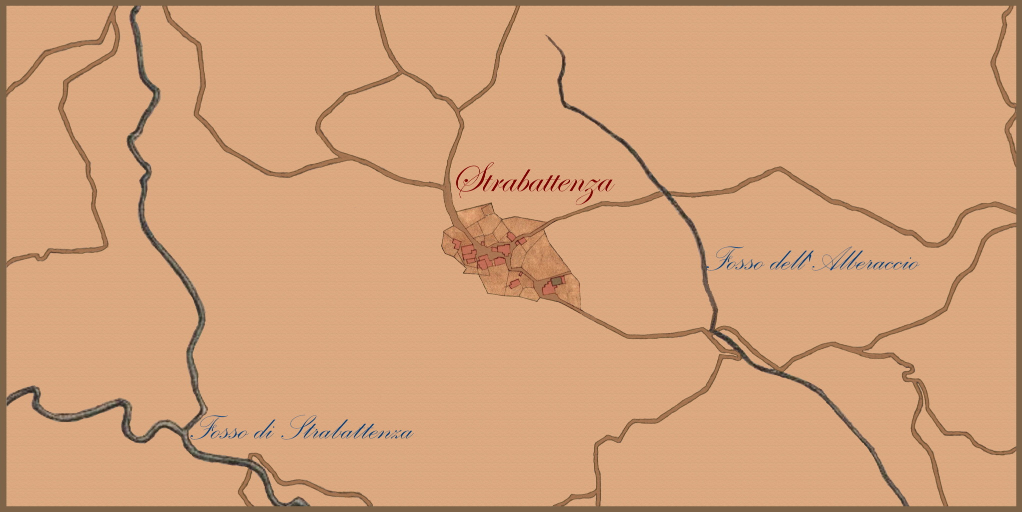 00b4 – Schema da mappa catastale della prima metà dell’Ottocento di Strabatenza e dintorni, con riferimento alla toponomastica originale.