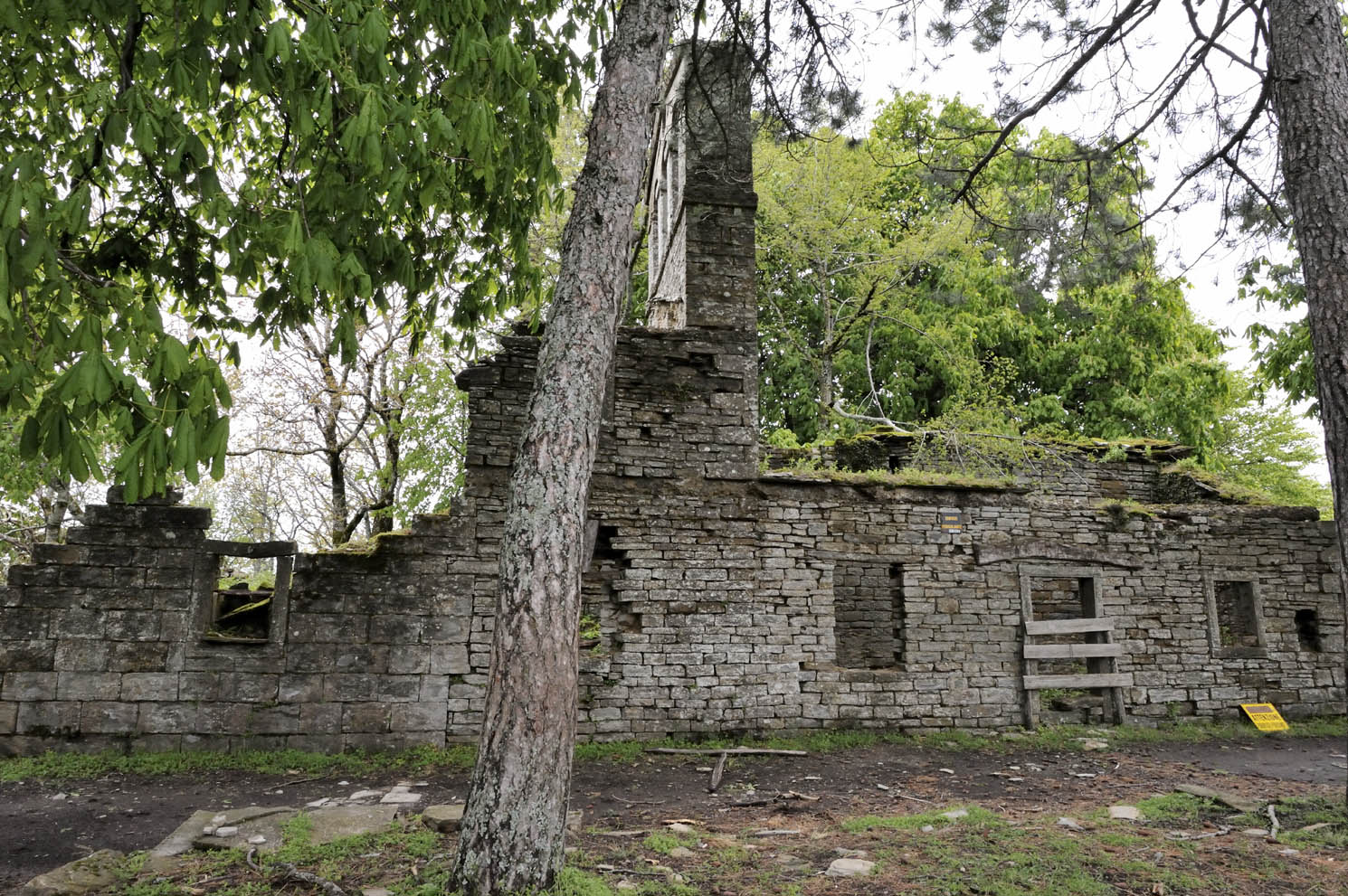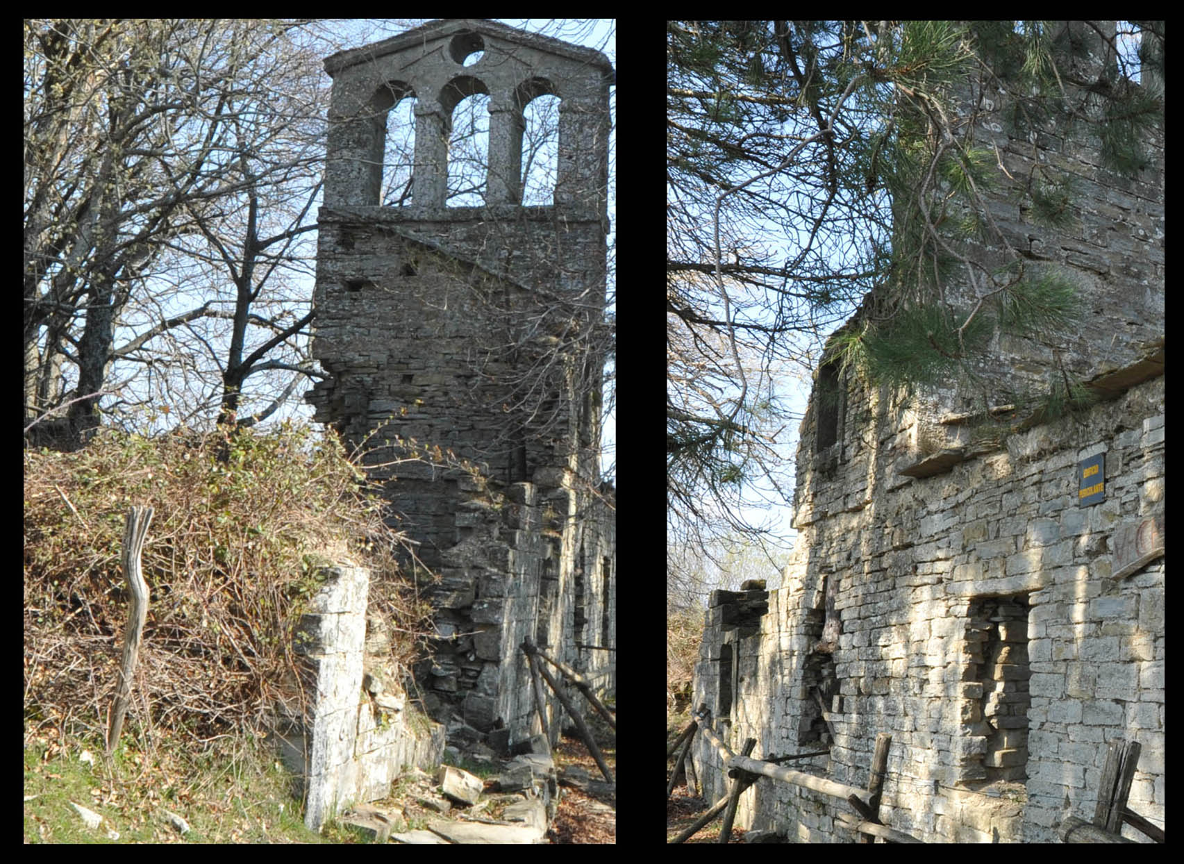 005a/005m – I resti del fabbricato religioso. Da notare una volumetria sul lato sx della chiesa, piccola parte della quale potrebbe corrispondere a qualche resto della Cappella di S. Paolo, se ancora presente al momento del terremoto del 1918 ma comunque modificata nella ricostruzione, ed almeno un locale era destinato a scuola; poteva altresì essere presente anche in forme diverse l’osteria ricordata da una rustica insegna. Nel collage finale si evidenzia la porzione della canonica retrostante il campanile a vela, di cui rimane parte della muratura e della finestra del secondo piano; il cordolo di conglomerato cementizio introdotto con la ricostruzione post-terremoto mostra la ridotta resistenza al degrado rispetto alla pietra che lo sorregge. Il grande campanile a vela, il cui timpano della trifora è in muratura di laterizio intonacata, pare iniziativa della ricostruzione incoerente con la tipologia di una piccola chiesa di montagna (26/03/12 - 18/11/15 - 16/05/19).