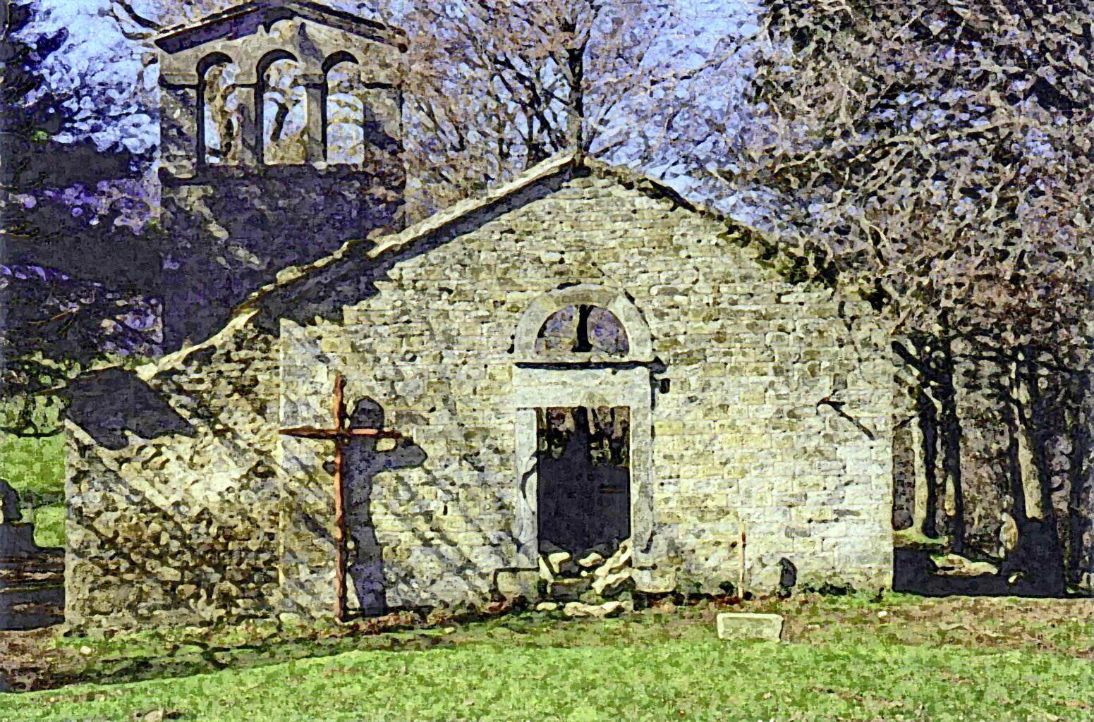 005z1 - 005z2 – Elaborazioni pittoriche tipo olio di particolare da foto storica prebellica da cui, tra l’altro, si rileva la consistenza dell’annesso agricolo con tre accessi di probabili stalletti e la grande apertura tipica dei fienili sottotetto, e della chiesa in tempi moderni dopo il crollo del tetto.