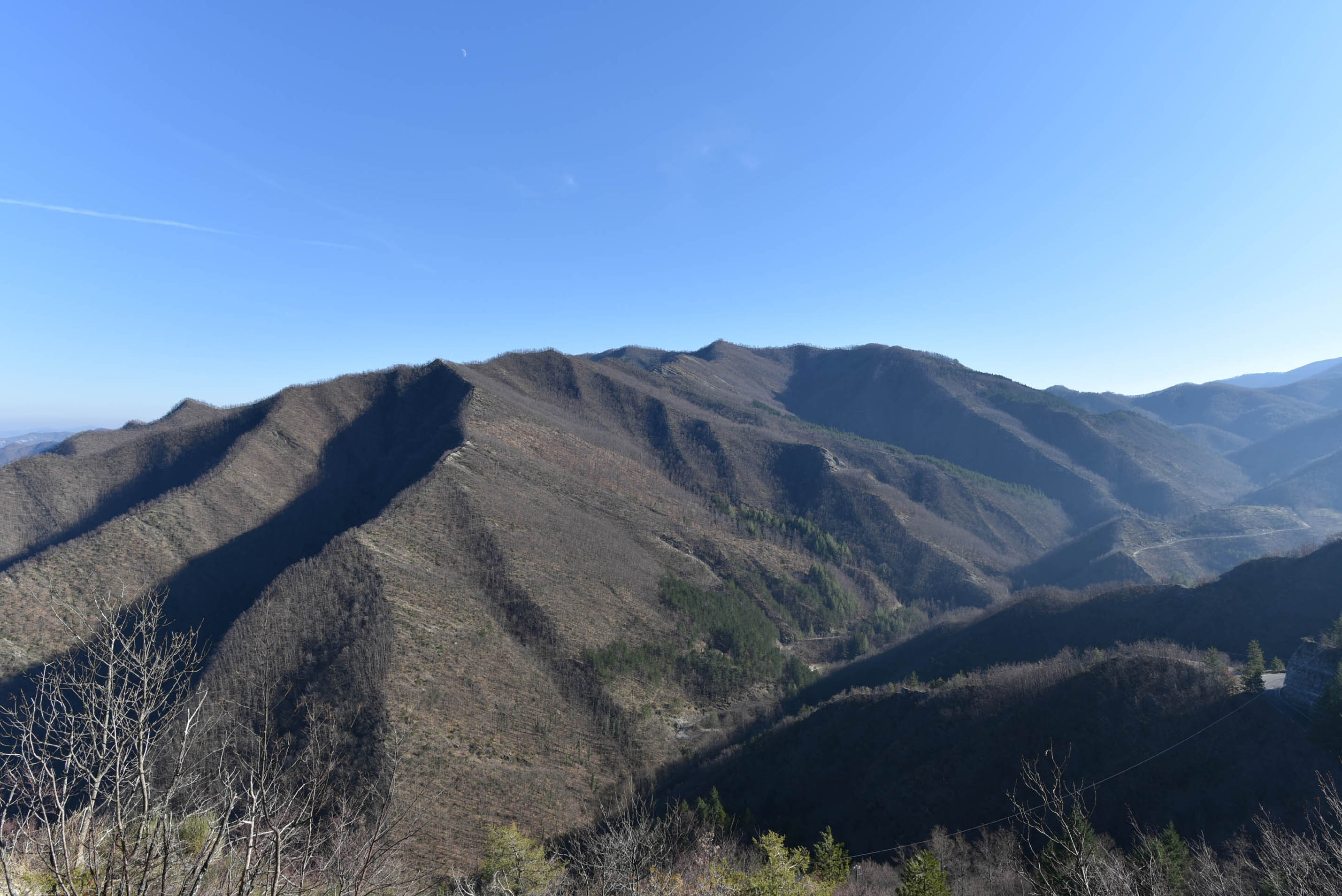 001d/001n - Da vari siti lungo la S.P. 4 del Bidente si apprezzano le caratteristiche geomorfologiche e vegetazionali della vallecola di Ristèfani, tra cui la netta differenza dei suoi opposti versanti, dovuta alla diversa giacitura dell’ambiente marnoso-arenaceo, che ne ha condizionato la frequentazione e l’utilizzo (26/03/12 – 11/02/16).