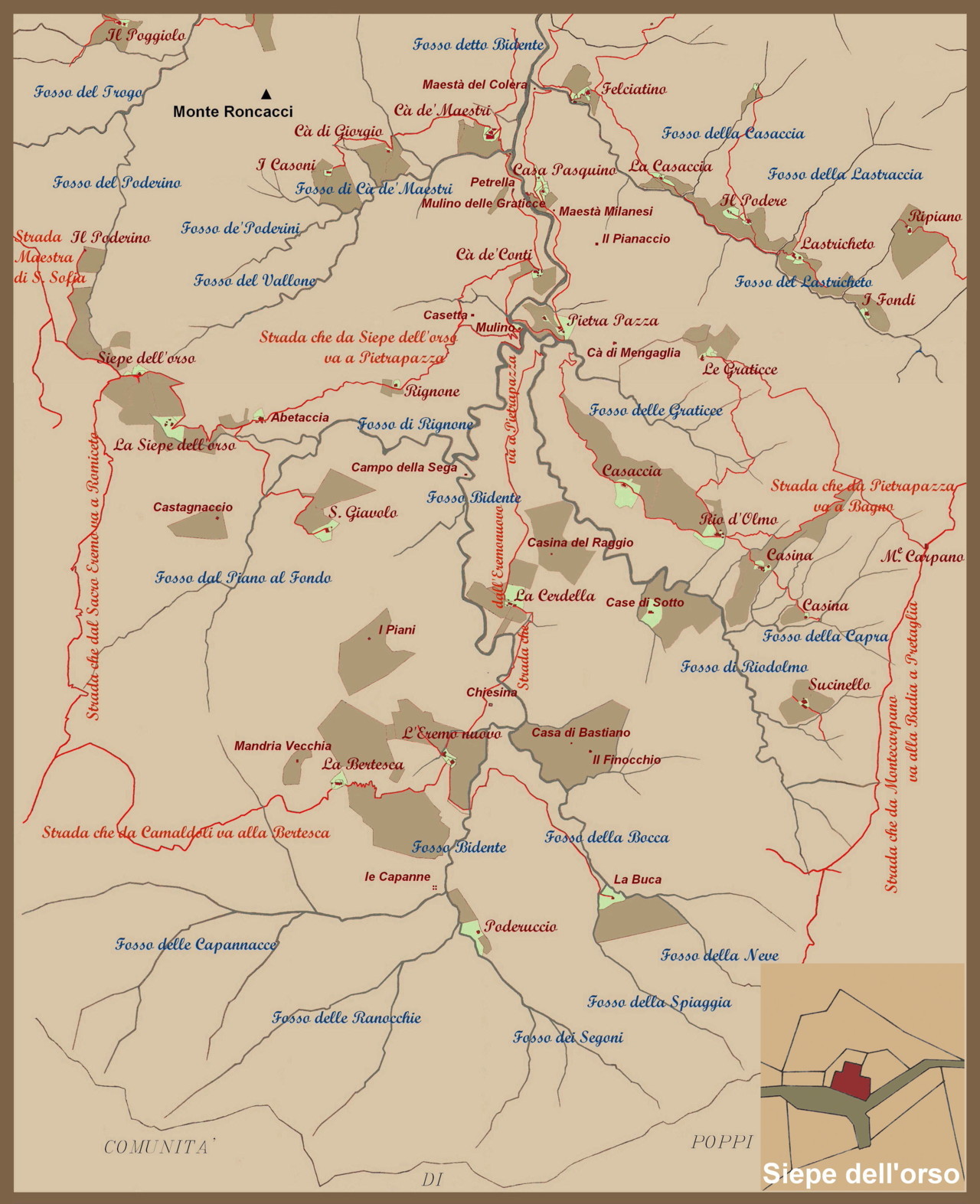Se riguardo la collocazione della casa censita nel 1546 non vi sono certezze, già per la fine del secolo vari documenti contengono riferimenti riguardo lo sdoppiamento poderale (cfr. C. Bignami, A. Boattini, 2018, cit.). In base alle risultanze dei dettagliati studi svolti dalla fine degli anni ’70 riguardo la Vallata del Bidente (che hanno prodotto una completa documentazione utilizzata per mostre e pubblicazioni, tra cui la cit. AA.VV, 1984, digitalizzata e disponibile sul sito camerale della committente Camera di Commercio di Forlì-Cesena), in relazione all’identificazione e collocazione dei fabbricati dei due distinti poderi, dopo la citazione dell’inventario dell’Opera sopra riportata, si legge: «Le mappe del Catasto Toscano (1825-30) rilevano, sotto il toponimo “Siepe dell’Orso”, due edifici colonici, uno dei quali, posto in posizione più bassa lungo la mulattiera per Pietrapazza (pc. 189-193) era il podere originariamente di proprietà dell’Opera del Duomo di Firenze. La casa era allora in rovina (è descritta come “casa diruta” nell’allegato Giornale di Campagna): in parte apparteneva al Monastero di Camaldoli (che nel 1918 aveva ricevuto in enfiteusi i beni dell’Opera), in parte a Babbini Salvetti Gio. Franco. Non ne rimangono tracce. L’altro edificio (pc. 46), sull’area attuale, risultava invece interamente di proprietà di Babbini Salvetti Gio. Franco. […] NOTE STORICHE - L’edifico scomparso, posto più a valle dell’attuale, appartenne all’Opera del Duomo di Firenze […]. Dell’edificio colonico sorprendentemente non abbiamo più notizie […]» (www.fc.camcom.it/area biblioteca/documento.htm?ID_D=4931, V Le Case Sparse, tavola _99.jpg). Ricerche d’archivio recenti (cfr. C. Bignami, A. Boattini, 2018, cit.), in particolare sugli estimi del Comune di Poggio alla Lastra del 1632 e del 1699, hanno evidenziato opposte risultanze. Il podere di Siepe dell’Orso posto più in alto, infatti confinante con le aree poste a monte del Vallone e del Poderino, che dal 1651 era posseduto da tal Valbonesi, nel 1699 risultava ormai divenuto dei camaldolesi, che ne mantennero la proprietà fino al 1741. Dai primi decenni del Settecento l’area risulta così suddivisa nei tre poderi di Siepe dell’Orso di Sopra, di Mezzo e di Sotto, gli ultimi due adiacenti e corrispondenti alle case scomparse. Di esse, nel 1940 sono stati rinvenuti alcuni ruderi a quota 910-915 m.