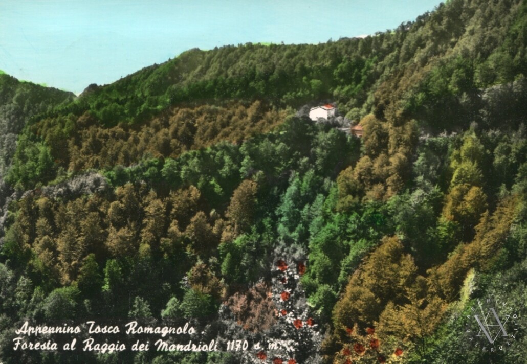 00b8-4 – Riproduzione di cartolina gentilmente concessa dall’Archivio Stefano Valbruzzi, composto da una vasta collezione fotografica e di cartoline di grande interesse storico/culturale ed ambientale, tra cui alcune riguardanti la Strada dei Mandrioli riprodotte in https://www.alpeappennina.it/rivista/la-strada-dei-mandrioli/, per cui si ringrazia Alpe Appennina e Monti editore per l’ulteriore consenso alla riproduzione. Dalla descrizione si evince che si tratta di una cartolina b/n, con colorazione acquerellata, lucida, cm 14,8×10,3, autore: Foto J. Moretti – S. Piero in Bagno, viaggiata nel 1965. Viene qui riprodotta in quanto contiene una delle rare vedute del versante orientale di questo tratto di crinale tagliato dal Passo dei Mandrioli, con punto di ripresa sulla linea del Monte Zuccherodante, risalente agli Anni Sessanta e quindi oggi forse non più possibile per l’accrescimento della vegetazione. L'edificio che si nota, per l'orientamento delle falde del tetto in relazione al punto di ripresa, corrisponde al retro del Raggio.
