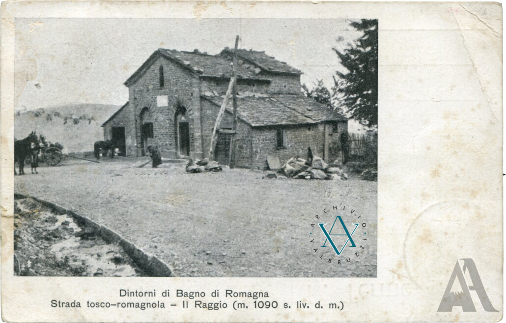 00e6a – 00e6b - Riproduzione di cartolina gentilmente concessa dall’Archivio Stefano Valbruzzi, composto da una vasta collezione fotografica e di cartoline di grande interesse storico/culturale ed ambientale, tra cui alcune riguardanti la Strada dei Mandrioli riprodotte in https://www.alpeappennina.it/rivista/la-strada-dei-mandrioli/, per cui si ringrazia Alpe Appennina e Monti editore per l’ulteriore consenso alla riproduzione. Dalla descrizione si evince che si tratta di una cartolina B/N, su cartoncino semilucida con immagine decentrata al lato sx, cm 13,8×8,8, autore Grande Albergo delle RR. Terme – Bagno di Romagna, con soggetto la Cantoniera/osteria del Raggio, viaggiata nel 1916. Viene qui riprodotta, accompagnata da elaborazione grafica evidenziante la tipologia architettonica, in quanto la foto è databile almeno al 1908 per via della lapide posta in tale data, pertanto evidenzia la tipologia originaria di impianto basilicale della Cantoniera di Raggio con facciata a salienti e semipilastri decorativi. L’adozione dello stile Novecento con arcate goticheggianti (allora imperante) per una cantoniera e la qualità costruttiva e progettuale, sono significativi dell’importanza attribuita all’epoca all’insieme dell’opera stradale.