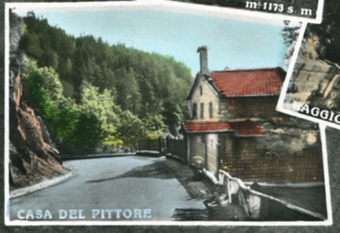 00g5 – 00g6 - Riproduzione di cartolina per gentile concessione dell’Archivio Stefano Valbruzzi, composto da una vasta collezione fotografica e di cartoline di grande interesse storico/culturale ed ambientale, tra cui alcune riguardanti la Strada dei Mandrioli riprodotte in https://www.alpeappennina.it/rivista/la-strada-dei-mandrioli/, per cui si ringrazia Alpe Appennina e Monti editore per l’ulteriore consenso alla riproduzione. Dalla descrizione si evince che si tratta di una cartolina Gruss aus, a tre foto, b/n con colorazione acquerellata, lucida, cm 14,5×10,3, autore: Foto J. Moretti – S. Piero in Bagno, soggetto, diversi scorci della strada dei Mandrioli, viaggiata nel 1966. Gruss aus (o Grüße aus) è un’espressione tedesca che significa 'Saluti da' o 'Saluti di/da', spesso usata nelle prime cartoline illustrate prodotte tra la fine del XIX e l'inizio del XX secolo; originario dell'Austria-Germania, questo genere di cartolina paesaggistica si diffuse in Italia dal 1885 come 'saluti da', raffigurando monumenti e scorci cittadini. Viene qui riprodotta in quanto rara raffigurazione, sebbene limitata ad una “vedutina” (vedi particolare), della Casa del Pittore.