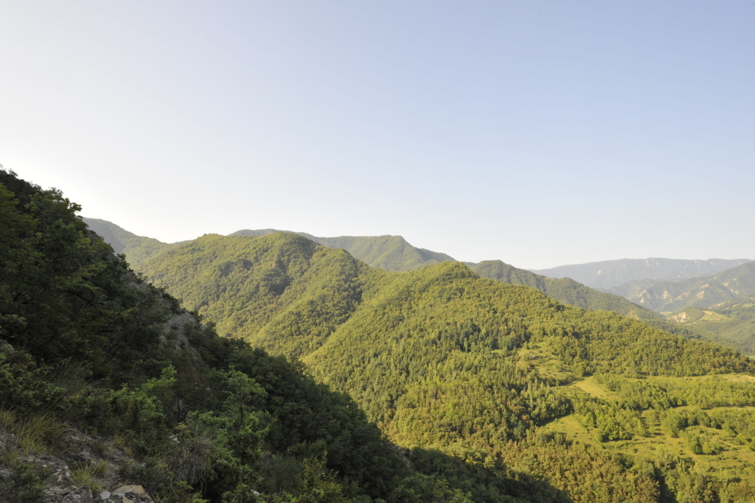 00c1/00c7 - Dal versante occidentale del Monte Carnovaletto, panoramica della valle del Bidente di Ridràcoli. Da sx la dorsale del Monte Dragone mostra il versante della Valle delle Corneta con le prime pendici occupate dai campi di Farnetino (in p.p.) e Farnetone in corso di rinaturalizzazione; emerge appena la dorsale di Poggio delle Stolle. Oltre il corso del Bidente, segnalato da una fascia boscata, si erge il contrafforte secondario proveniente da Poggio Scali ed ormai al suo termine con Poggio Castellina. Infine, scorcio verso la S.P. 112 da cui, presso il fabbricato La Maestà, si stacca la pista che scende al guado ed alla passerella sul Bidente di Ridràcoli, presso il Molino della Sega (24/07/18).
