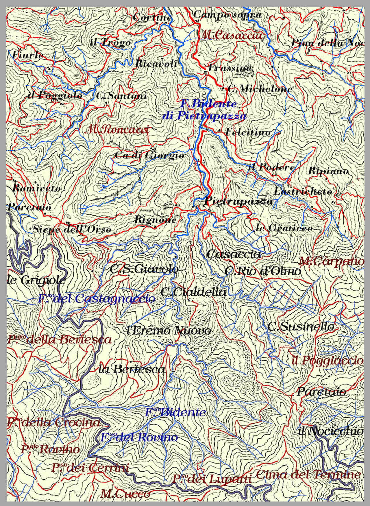 In particolare, il bacino idrografico del Fosso Fondo Rignone appartiene ad un tratto di versante orientale del contrafforte secondario, compreso tra Poggio della Bertesca, il terrazzamento orografico interglaciale di Pian della Saporita, l’area dell’Eremo Nuovo e la dorsale che staccandosi dietro Siepe dell’Orso si sviluppa fino al Bidente subito a monte di Pietrapazza, delimitando a Nord la valle dei Fossi del Vallone e dei Poderini, dorsale già detta Raggio di Valprandola, la parte alta e Raggio da Rignuno o Rignuni o di Rignone, il tratto inferiore. Questo brano di territorio è reso particolarmente impervio dal susseguirsi di diramazioni montane che danno origine ad un fitto e quasi indistinguibile reticolo idrografico, tra cui si identificano il Fosso del Castagnaccio e il suo ramo alto, che forse indentifica l’intero torrente, significativamente detto dal Piano al Fondo (ovvero da Pian della Saporita al Fosso Fondo o al fondo vallivo), affluente del Fondo Rignone, e il Fosso di S. Giavolo, affluente del Bidente. Il ramo principale del Fosso Fondo Rignone (accoppiamento toponomastico accrescitivo del termine, dal latino classico, rivus e tardo latino rigus, con il significato sia di fossone, vallone sia di rigagnolo) ha origine dall’ampia sella del contrafforte al Paretaio, che costituisce passo montano di collegamento con la viabilità di crinale e con la Valle di Ridràcoli. Nel XVI secolo il Rignone era l’area più elevata che si estendeva fino all’Abetaccia e a S. Giavolo mentre l’Himo Rignone o Rignone Basso riguardava l’area della Casetta, estendendosi fino a Cà dei Conti, a Petrella e al Mulino Milanesi di Pietrapazza o di Cà del Conte. L’area fino alla zona dell’Eremo Nuovo era detta Sangiavolo. Nel XVIII secolo la parte elevata era semplicemente detta Monte e i coltivi di Siepe dell’Orso erano detti i Campi da Monte.