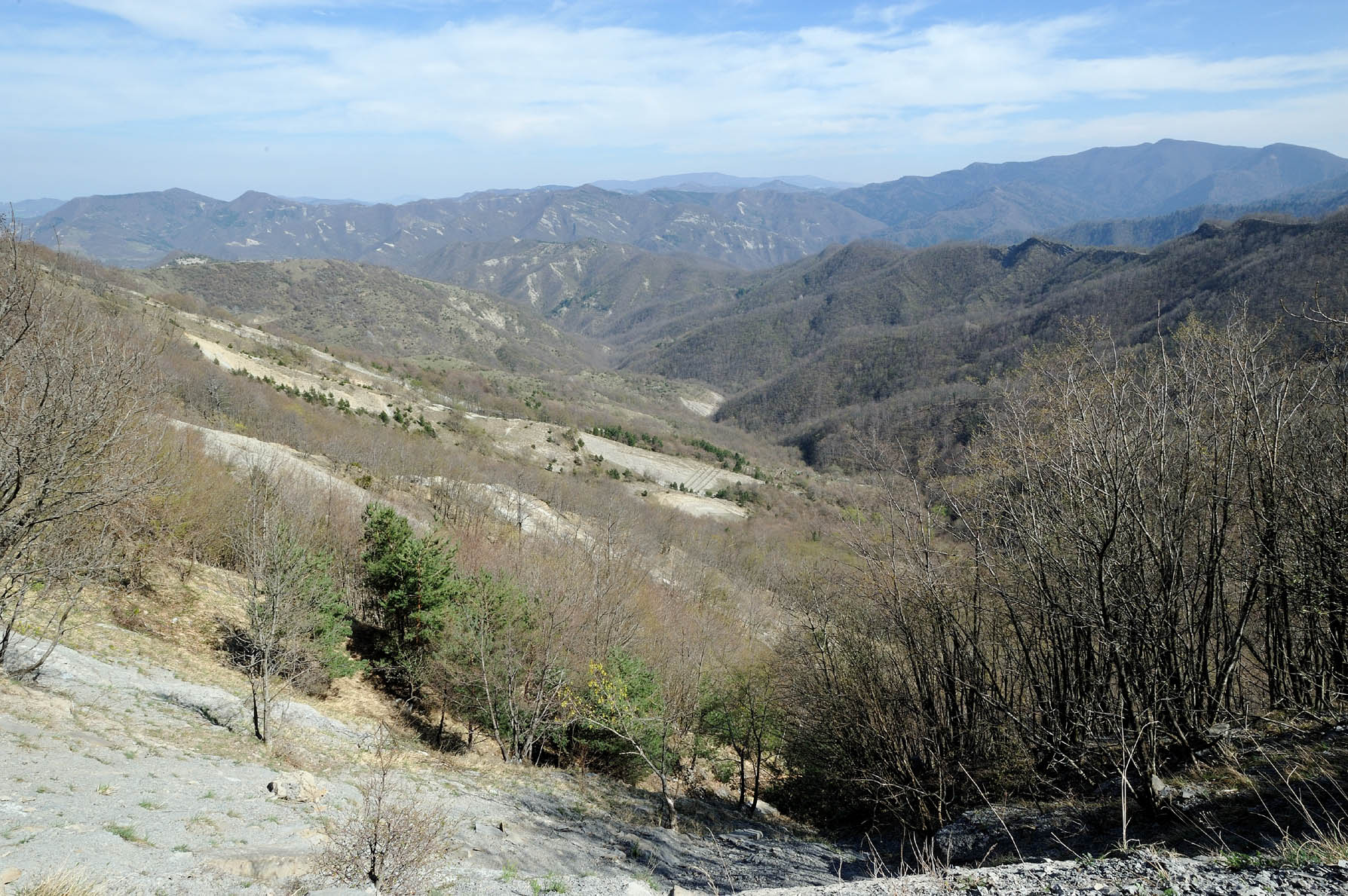 001d/001o - Dal varco del Canale del Pentolino, sulla Giogana presso Poggio Scali, vedute del contrafforte e del sistema vallivo Ciriegiolone/Pozzacchere/Aiaccia/Molinuzzo in varie stagioni (6/05/11 – 2/09/11 - 11/12/14 – 15/05/14).