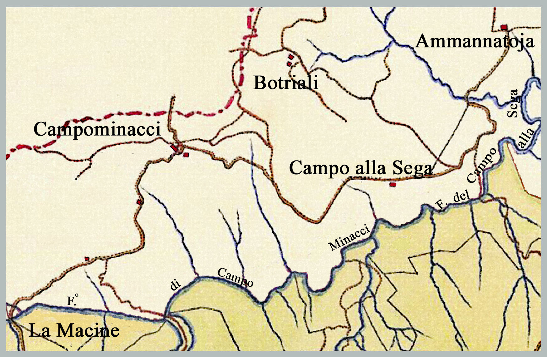 La minore acclività di tratti del versante sx della valle, al contrario di quella della Riserva, ha consentito il diffondersi di insediamenti ed appoderamenti dediti al pascolo e al taglio del bosco, infatti il ricorrente toponimo ricorda la principale attività svolta nell’area dai secoli addietro fino alla prima metà del XX … «Ivi il Padre Apennino non corruso ma verde, mostravasi aperto e vestito con alberi sul fianco, appiè del quale una cascata di acque da sega in sega e tra i massi rompendosi lieve lieve come velo copriva un ponticello …» (P. Ferroni, Autobiografia, 1825, in: G.L. Corradi, O. Bandini, “Per quanto la veduta consenta di spaziare”. Scelta di testi dal XIV al XIX secolo, in: G.L. Corradi, O. Bandini, 1992, p.78, cit.). Gli insediamenti superstiti sono alcuni fabbricati del nucleo de La Seghettina e, fino a pochi decenni addietro, Campominacci, già Campo Minacci, Campo di Minaccio e Campo Ominacci, che giunse ad essere recuperato ed indicato come rifugio nella prima cartografia del Parco delle Foreste Casentinesi, oggi ormai abbandonato al destino di rudere, come peraltro l’Ammannatoia, già Mannatoia o Manatoia o Menatoja ed i Botriali, già Butriali. Di Pratovecchio e Poggio a Pratovecchio (posti sul crinale di Poggio della Gallona ma il primo appartenente al sistema vallivo del Fosso del Molinuzzo) e di Campo alla Sega rimangono poche pietre. Vari capanni (di alcuni si trovano resti poco consistenti) si trovavano sia sulla sella del contrafforte posta a monte dell’origine del Fosso delle Macine, l’ex rifugio di Pian del Pero, sia presso il suo corso (uno a metà circa di probabile uso forestale, uno verso il termine, forse un’antica macina, peraltro posta in un sito ancora nel XIX secolo noto come La Macine) sia presso Campominacci e Campo alla Sega.