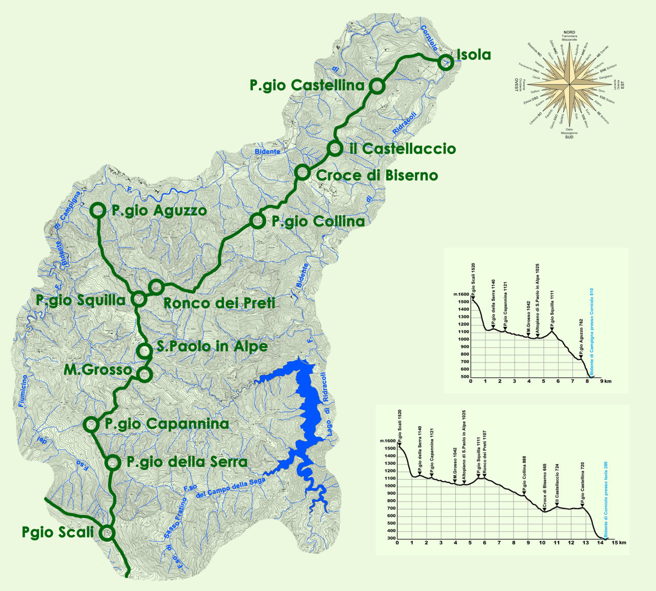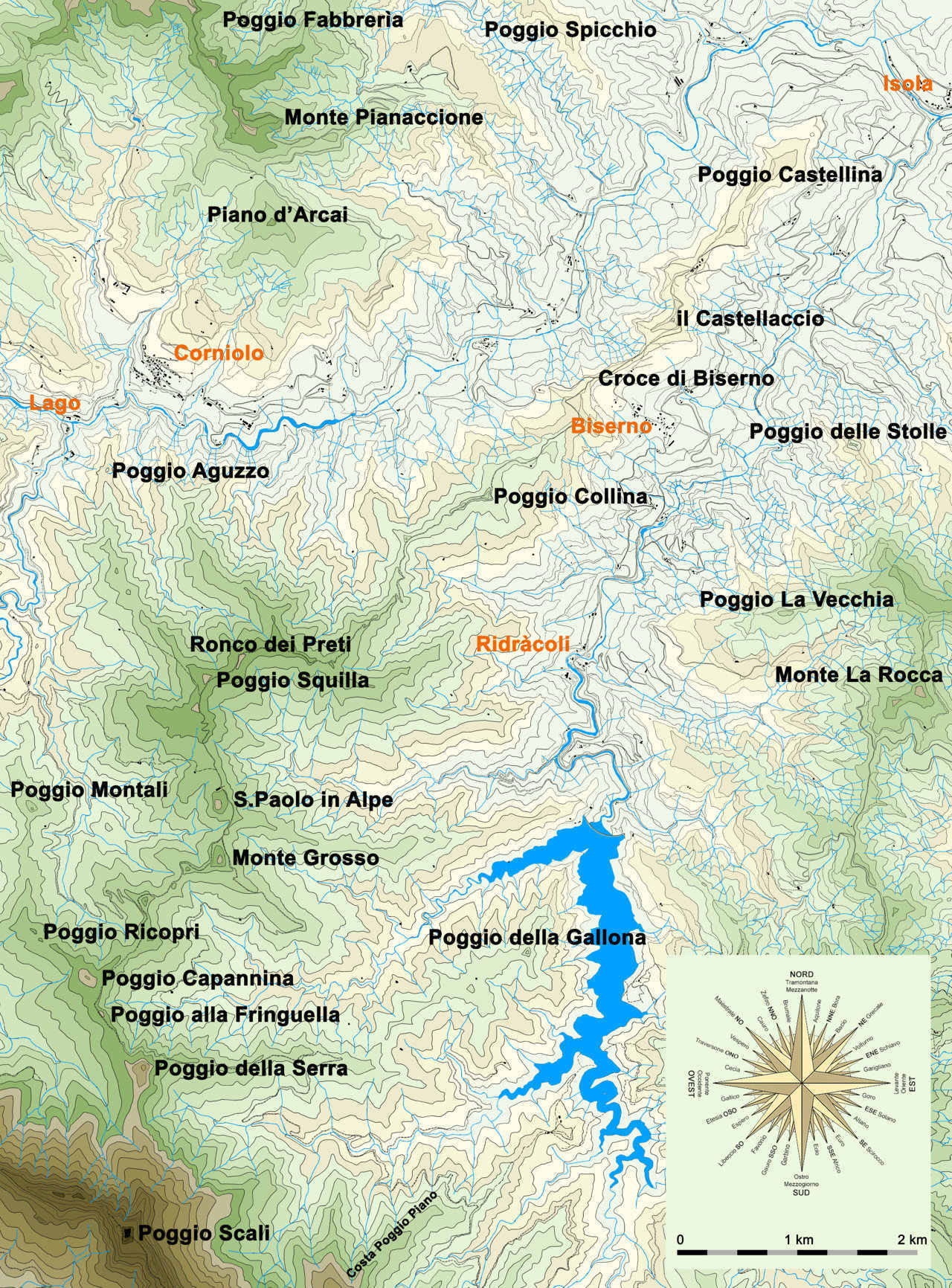 Come accennato, il contrafforte secondario che si stacca da Poggio Scali precipita ripidissimo verso settentrione disegnando la sella “a corda molle” di Pian del Pero, da Poggio della Serra inizia a serpeggiare cambiando spesso direzione ed evidenziando una sequenza di rilievi (Poggio Capannina, Monte Grosso, Altopiano di S.Paolo in Alpe, Poggio Squilla e Ronco dei Preti) comunque complessivamente sviluppandosi nella direzione NE, che viene ripresa poco dopo Ronco dei Preti a seguito della deciso modifica di direzione cui fa seguito il rettilineo tratto finale. Questo tratto si rialza prima con Poggio Collina, disegna quindi l’ampia sella dove la Croce di Biserno segnala il luogo di passo tra le valli dei Bidenti di Ridràcoli e di Corniolo, subisce gli ultimi rialzamenti intercalati da lievi insellamenti mostrando prima il picco dove sorge il Castellaccio di Biserno poi la gobba di Poggio Castellina, che prelude al digradare finale presso Isola, dopo circa 14 km. Da Poggio Squilla si dirama una modesta dorsale o contrafforte terziario che sviluppandosi verso Corniolo mostra numerosi rialzamenti e picchi, tra cui Poggio Aguzzo, andando a determinare quel delicato assetto idro-geo-morfologico del sito di Lago per la plurima convergenza fluviale e di dorsali dove il Bidente di Campigna curva repentinamente accingendosi a dare origine al Bidente di Corniolo.