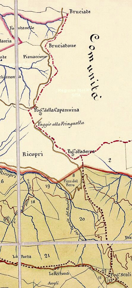 La sopracitata Via Maestra che vien dall’Eremo nel Catasto toscano riguardo al tratto di contrafforte fino al Passo della Bertesca viene riclassificata Strada che dal Sacro Eremo va a Romiceto (oggi sent. 207 CAI), per il tratto dal passo a Casanova dell’Alpe diviene Strada Maestra di S. Sofia e Strada che dalla Casanova va a Santa Sofia in riferimento al tratto oltre il Monte Moricciona compreso tra la Ripa di Ripastretta e il Passo del Vinco: quest'ultimo interessava il Monte La Rocca e raggiungeva il Passo della Colla, aggirava i Monti Pezzoli e Marino sul versante SE e scendeva a Poggio alla Lastra divenendo di fondovalle fino a S.Sofia.