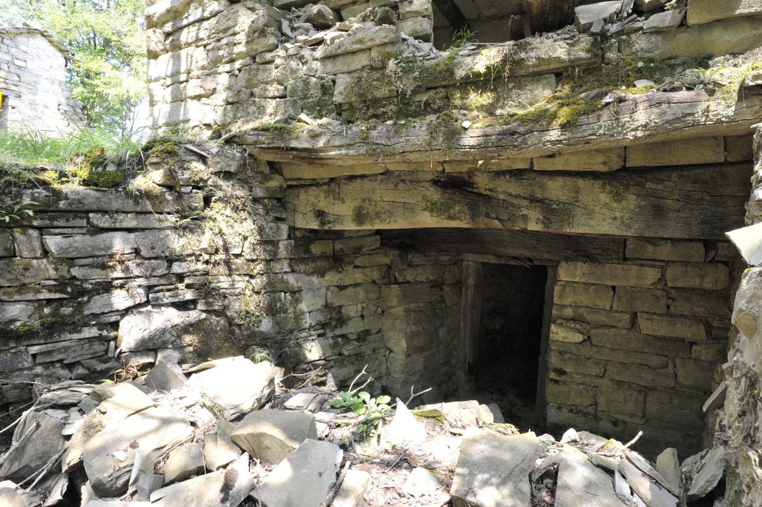 00i8/00i18 – L’ingresso alla parte abitativa avveniva a monte ed era preceduto da una loggia con forno; nel locale cucina è ancora riconoscibile il camino e la ripida scala che veniva utilizzata ogni sera per accedere al sottotetto abitabile; graffiti ricordano quando l’immobile era ormai abbandonato ma occasionalmente visitato (24/07/18).