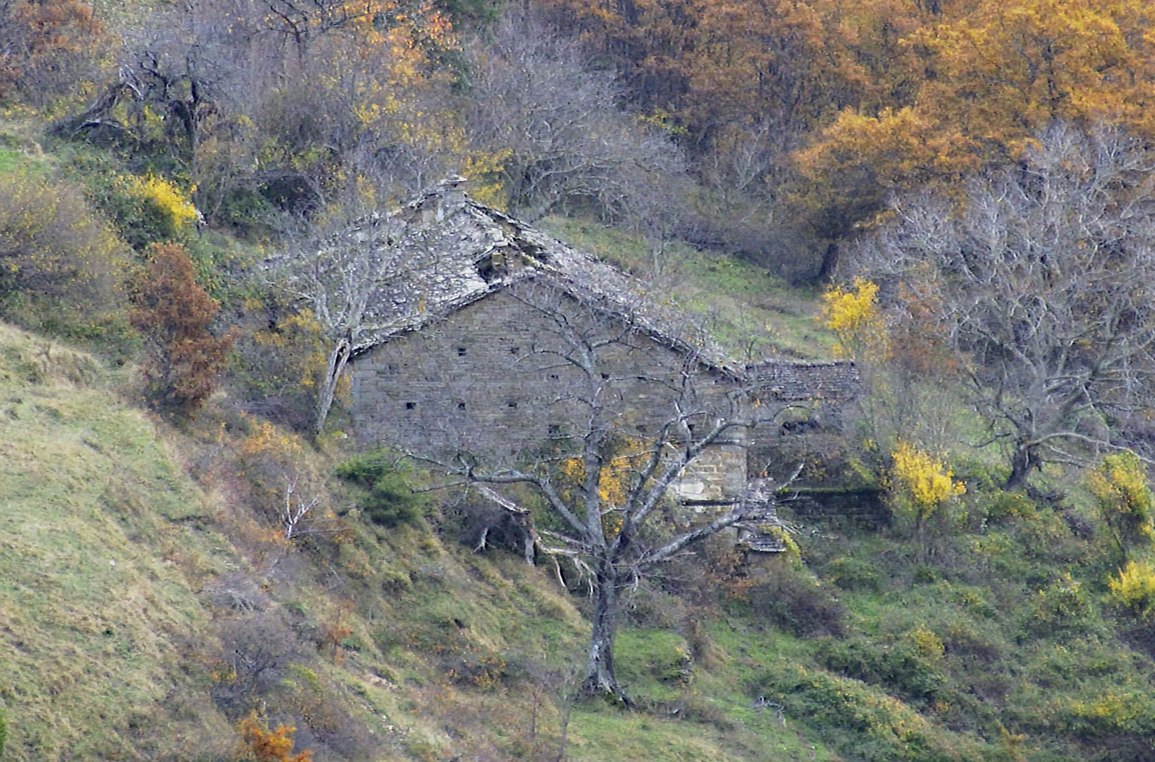Testo di Bruno Roba - Dalla S.P. 4 del Bidente, giunti a Corniolo si devia sulla rotabile ripidissima ma ben tenuta che risale la Val Bonella raggiungendo il Passo della Braccina, sul contrafforte principale che divide le Valli di Corniolo e di Fiumicello. Dall’area di sosta, superata la sbarra si imbocca la ripida pista, riservata per uso agricolo e forestale, ripercorsa dal Sentiero degli Alpini 301 CAI che, dai 961 m del passo, dopo circa 1 km spiana intorno ai 1140 m che poi mantiene transitando dopo circa 300 m accanto alla vetta (lato S) del Monte dell’Avòrgnolo. Da qui procedendo verso il Monte Cavallo, la valle di Lavacchio compare quasi interamente nel suo sviluppo dall’alto della sua testata, così come nel procedere si scorgono i suoi insediamenti. Dopo per 700 m dal Monte dell’Avòrgnolo inizia la discesa nella valle su sentieri non segnati e dopo circa 150 si raggiunge Lavacchio di Sopra, evidente sotto il crinale. Proseguendo la discesa per circa 700 m in scarsità di tracce evidenti si raggiunge Lavacchio di Mezzo, da qui occorrono 4-500 m per giungere a Lavacchio di Sotto, a seconda della traccia seguita ed altri 500 m separano da Campo di Fuori. Si può risalire anche da Lago tramite la mulattiera non segnata Casina-Cà di Belletta-Capria di Sopra, corrispondente alla via antica, o la rotabile S.Giovanni-Cà d’Armati-Cà d’Orso-Cà di Belletta, in parte corrispondente alla via antica, raggiungendo i fabbricati in senso inverso. Da Cà di Belletta, circa km 1,0 o 1,4 da Lago a seconda dei due percorsi scelti, in 600 m si giunge al bivio di Capria di Sopra, ulteriori km 1,0 per Campo di Fuori, quindi i tre Fabbricati di Lavacchio secondo le distanze già indicate. Il ritorno è più agevole grazie alla costante discesa.