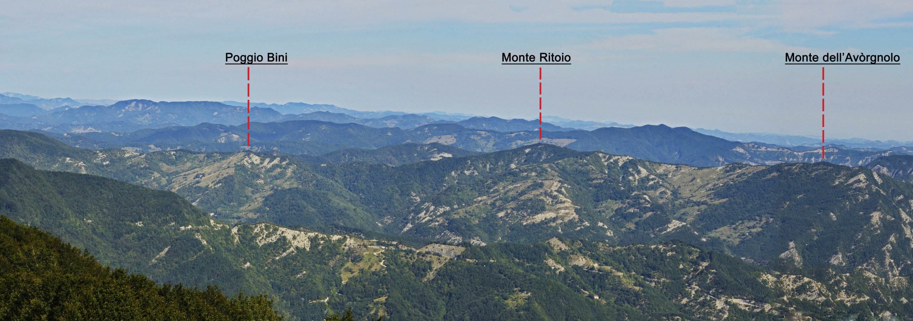 In questa prima parte emergono rispetto alla linea di crinale i picchi più o meno pronunciati del succedersi dei nodi montani, che mostrano sostanzialmente la medesima esposizione dei versanti fratturati a reggipoggio e di quelli pascolivi a franapoggio, tra cui il maggiore Monte Ritoio che deve il toponimo alla sua spiccata evidenza nella morfologia del contrafforte in quanto capace di “indicare la via”, “la retta via”: Mons Ritorius deriva infatti dal latino medievale retum, -i (anche reta, reda, retera), in italiano redola, resola, ovvero sentiero che rasenta un fiume o canale, con il suffisso -torius indicante una funzione sia strumentale che localizzativa (v. p.es.: abbeveratoio), quindi il luogo, il transito e il segnale. Peraltro, occorre ricordare che lo spartiacque tra il Bidente e il Rabbi costituiva anche parte di uno degli itinerari preferiti come Via del Sale per evadere l’esoso dazio pontificio, specie nel contrabbando dalle Pontificie Saline di Cervia verso il Granducato di Toscana, quindi per evitare di incappare nei controlli sui percorsi di fondovalle. Presso il Ritoio il contrafforte disegna un ampio anfiteatro esposto a SO, cui segue un amplissimo anfiteatro esposto a SE, pertanto con una rotazione di circa 90°, mentre i due anfiteatri hanno in comune il doppio picco del Monte Cavallo e la lunga e complessa dorsale che da esso si dirama, costituendo braccio di separazione delle due arene vallive. L’anfiteatro naturale che si apre sotto il Ritoio, compreso tra Poggio Bini, il Cavallo e detta dorsale, racchiude un ventaglio di fossi che costituiscono principalmente la testata del Fosso dei Fondi, raccogliendo anche le acque del Fosso del Foscolo, e accoglie gli ampi prati-pascoli di Acquaviva, il modesto insediamento de La Traversa e il podere di Foscolo. Dal Monte Ritoio si stacca inoltre una dorsale diretta con precisione a N, così suddividendo l’aspro pendio del versante di Pian di Mezzano rivolto ad O, inciso dalle ramificazioni scolanti nel Fosso di Fiumicello, dall’ulteriore anfiteatro, ristretto e impervio, che fa da testata al Fosso di Marcaccio.